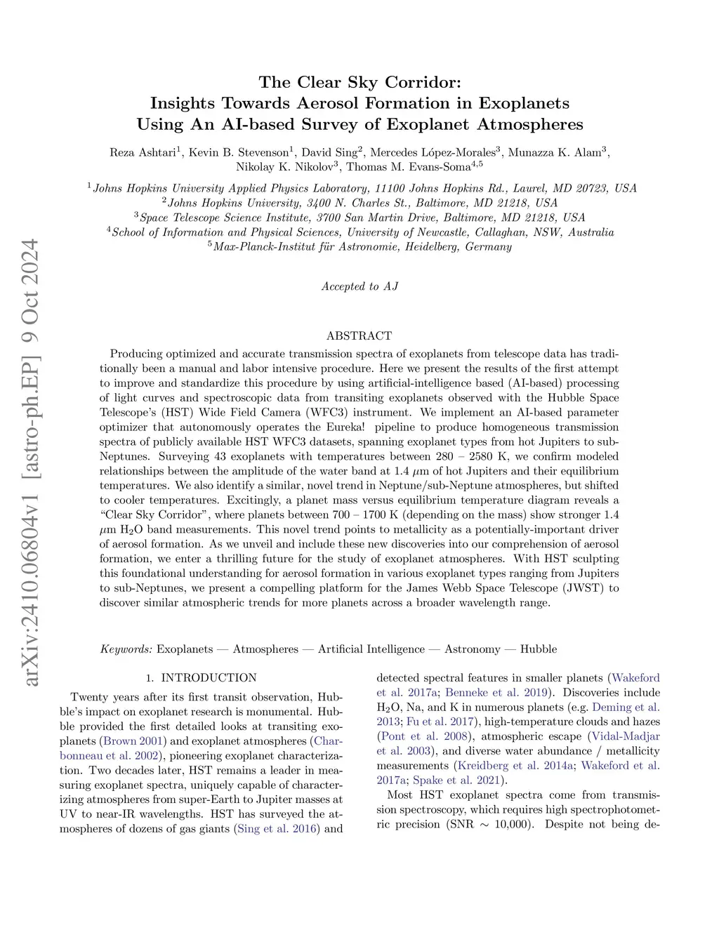 Producing optimized and accurate transmission spectra of exoplanets from telescope data has traditionally been a manual and labor-intensive procedure. Here we present the results of the first attempt to improve and standardize this procedure using artificial intelligence (AI) based processing of light curves and spectroscopic data from transiting exoplanets observed with the Hubble Space Telescope's (HST) Wide Field Camera 3 (WFC3) instrument. We implement an AI-based parameter optimizer that autonomously operates the Eureka pipeline to produce homogeneous transmission spectra of publicly available HST WFC3 datasets, spanning exoplanet types from hot Jupiters to sub-Neptunes. Surveying 43 exoplanets with temperatures between 280 and 2580 Kelvin, we confirm modeled relationships between the amplitude of the water band at 1.4um in hot Jupiters and their equilibrium temperatures. We also identify a similar, novel trend in Neptune/sub-Neptune atmospheres, but shifted to cooler temperatures. Excitingly, a planet mass versus equilibrium temperature diagram reveals a "Clear Sky Corridor," where planets between 700 and 1700 Kelvin (depending on the mass) show stronger 1.4um H2O band measurements. This novel trend points to metallicity as a potentially important driver of aerosol formation. As we unveil and include these new discoveries into our understanding of aerosol formation, we enter a thrilling future for the study of exoplanet atmospheres. With HST sculpting this foundational understanding for aerosol formation in various exoplanet types, ranging from Jupiters to sub-Neptunes, we present a compelling platform for the James Webb Space Telescope (JWST) to discover similar atmospheric trends for more planets across a broader wavelength range.