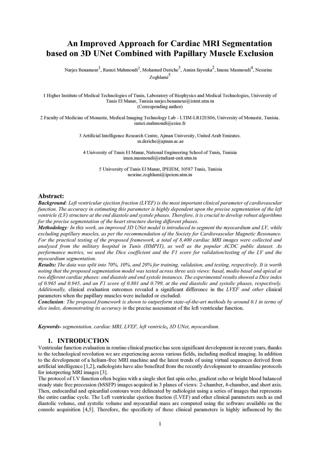 Left ventricular ejection fraction (LVEF) is the most important clinical parameter of cardiovascular function. The accuracy in estimating this parameter is highly dependent upon the precise segmentation of the left ventricle (LV) structure at the end diastole and systole phases. Therefore, it is crucial to develop robust algorithms for the precise segmentation of the heart structure during different phases. Methodology: In this work, an improved 3D UNet model is introduced to segment the myocardium and LV, while excluding papillary muscles, as per the recommendation of the Society for Cardiovascular Magnetic Resonance. For the practical testing of the proposed framework, a total of 8,400 cardiac MRI images were collected and analysed from the military hospital in Tunis (HMPIT), as well as the popular ACDC public dataset. As performance metrics, we used the Dice coefficient and the F1 score for validation/testing of the LV and the myocardium segmentation. Results: The data was split into 70%, 10%, and 20% for training, validation, and testing, respectively. It is worth noting that the proposed segmentation model was tested across three axis views: basal, medio basal and apical at two different cardiac phases: end diastole and end systole instances. The experimental results showed a Dice index of 0.965 and 0.945, and an F1 score of 0.801 and 0.799, at the end diastolic and systolic phases, respectively. Additionally, clinical evaluation outcomes revealed a significant difference in the LVEF and other clinical parameters when the papillary muscles were included or excluded.