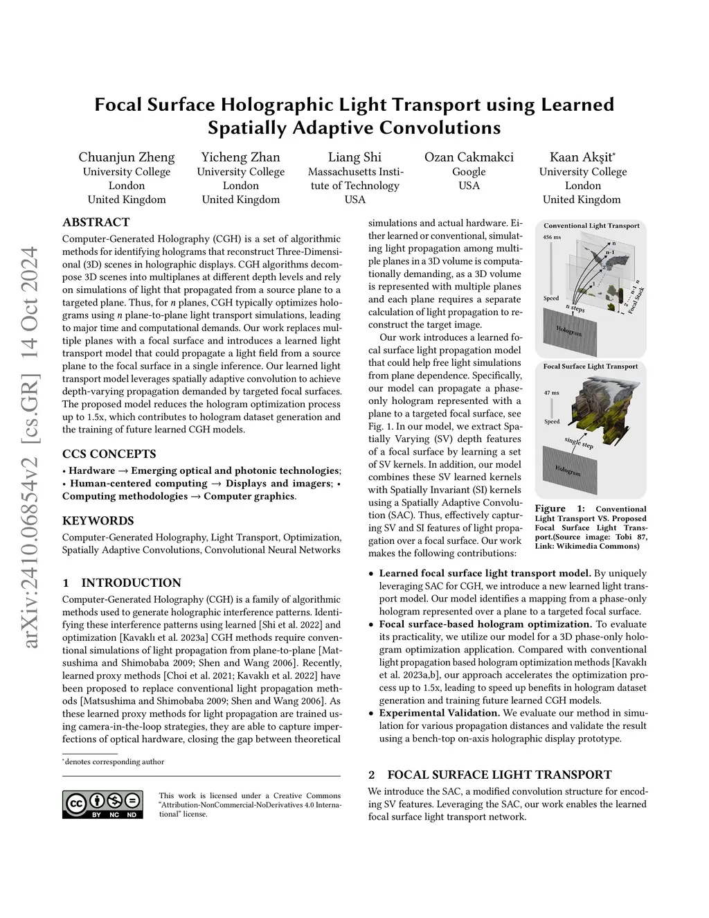Computer-Generated Holography (CGH) is a set of algorithmic methods for identifying holograms that reconstruct Three-Dimensional (3D) scenes in holographic displays. CGH algorithms decompose 3D scenes into multiplanes at different depth levels and rely on simulations of light that propagated from a source plane to a targeted plane. Thus, for n planes, CGH typically optimizes holograms using n plane-to-plane light transport simulations, leading to major time and computational demands. Our work replaces multiple planes with a focal surface and introduces a learned light transport model that could propagate a light field from a source plane to the focal surface in a single inference. Our learned light transport model leverages spatially adaptive convolution to achieve depth-varying propagation demanded by targeted focal surfaces. The proposed model reduces the hologram optimization process up to 1.5x, which contributes to hologram dataset generation and the training of future learned CGH models.