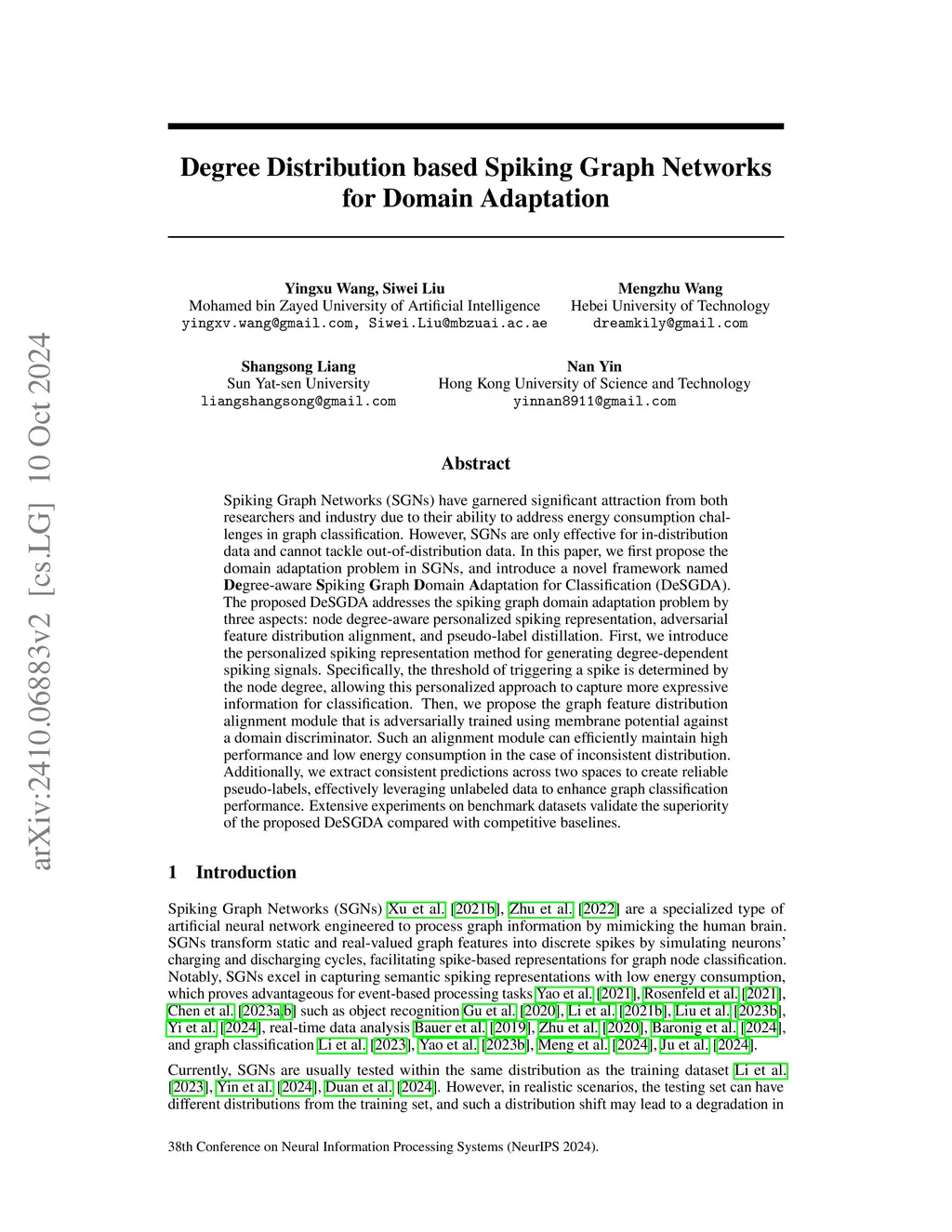 Degree-Conscious Spiking Graph for Cross-Domain Adaptation