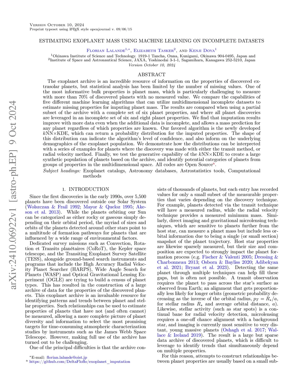 Estimating Exoplanet Mass using Machine Learning on Incomplete Datasets
