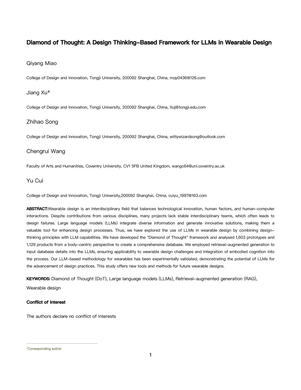 Wearable design is an interdisciplinary field that balances technological innovation, human factors, and human-computer interactions. Despite contributions from various disciplines, many projects lack stable interdisciplinary teams, which often leads to design failures. Large language models (LLMs) integrate diverse information and generate innovative solutions, making them a valuable tool for enhancing design processes. Thus, we have explored the use of LLMs in wearable design by combining design-thinking principles with LLM capabilities. We have developed the "Diamond of Thought" framework and analysed 1,603 prototypes and 1,129 products from a body-centric perspective to create a comprehensive database. We employed retrieval-augmented generation to input database details into the LLMs, ensuring applicability to wearable design challenges and integration of embodied cognition into the process. Our LLM-based methodology for wearables has been experimentally validated, demonstrating the potential of LLMs for the advancement of design practices. This study offers new tools and methods for future wearable designs.