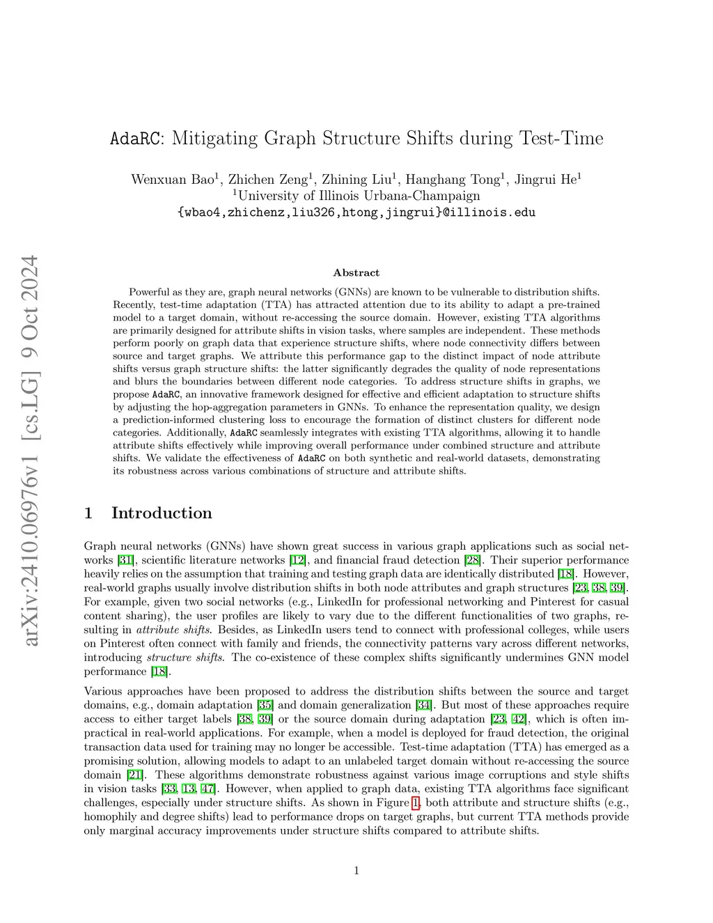 Powerful as they are, graph neural networks (GNNs) are known to be vulnerable to distribution shifts. Recently, test-time adaptation (TTA) has attracted attention due to its ability to adapt a pre-trained model to a target domain, without re-accessing the source domain. However, existing TTA algorithms are primarily designed for attribute shifts in vision tasks, where samples are independent. These methods perform poorly on graph data that experience structure shifts, where node connectivity differs between source and target graphs. We attribute this performance gap to the distinct impact of node attribute shifts versus graph structure shifts: the latter significantly degrades the quality of node representations and blurs the boundaries between different node categories. To address structure shifts in graphs, we propose Matcha, an innovative framework designed for effective and efficient adaptation to structure shifts by adjusting the htop-aggregation parameters in GNNs. To enhance the representation quality, we design a prediction-informed clustering loss to encourage the formation of distinct clusters for different node categories. Additionally, Matcha seamlessly integrates with existing TTA algorithms, allowing it to handle attribute shifts effectively while improving overall performance under combined structure and attribute shifts. We validate the effectiveness of Matcha on both synthetic and real-world datasets, demonstrating its robustness across various combinations of structure and attribute shifts. Our code is available atthis https URL.