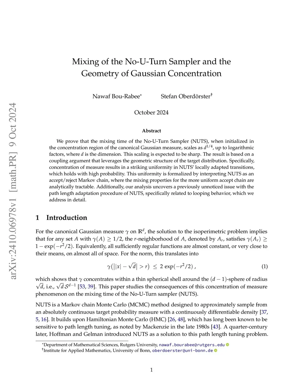 We prove that the mixing time of the No-U-Turn Sampler (NUTS), when initialized in the concentration region of the canonical Gaussian measure, scales as , up to logarithmic factors, where is the dimension. This scaling is expected to be sharp. This result is based on a coupling argument that leverages the geometric structure of the target distribution. Specifically, concentration of measure results in a striking uniformity in NUTS' locally adapted transitions, which holds with high probability. This uniformity is formalized by interpreting NUTS as an accept/reject Markov chain, where the mixing properties for the more uniform accept chain are analytically tractable. Additionally, our analysis uncovers a previously unnoticed issue with the path length adaptation procedure of NUTS, specifically related to looping behavior, which we address in detail.