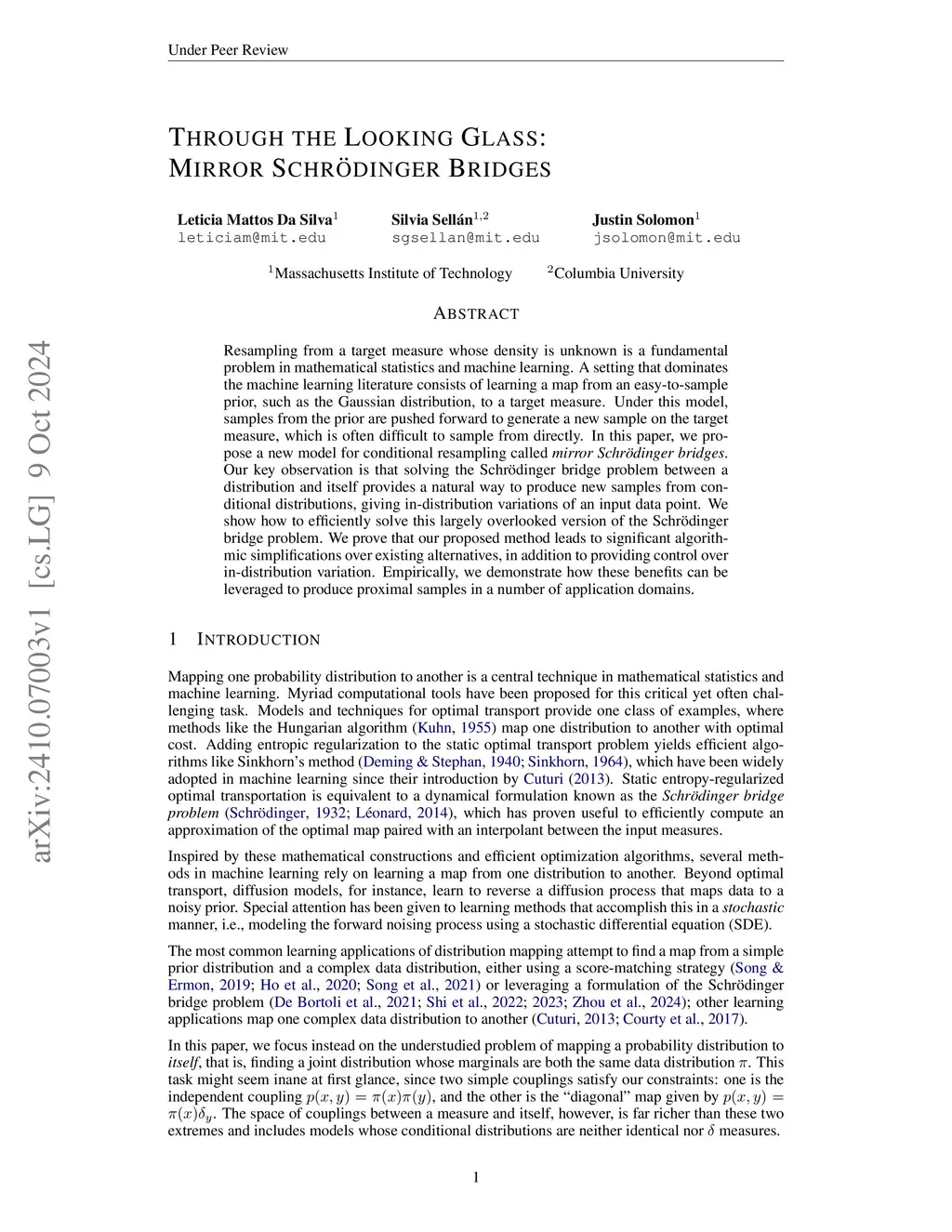 Resampling from a target measure whose density is unknown is a fundamental problem in mathematical statistics and machine learning. A setting that dominates the machine learning literature consists of learning a map from an easy-to-sample prior, such as the Gaussian distribution, to a target measure. Under this model, samples from the prior are pushed forward to generate a new sample on the target measure, which is often difficult to sample from directly. A related problem of particular interest is that of generating a new sample proximate to or otherwise conditioned on a given input sample. In this paper, we propose a new model called the mirror bridge to solve this problem of conditional resampling. Our key observation is that solving the Schrödinger bridge problem between a distribution and itself provides a natural way to produce new samples, giving in-distribution variations of an input data point. We demonstrate how to efficiently estimate the solution of this largely overlooked version of the Schrödinger bridge problem. We show that our proposed method leads to significant algorithmic simplifications over existing alternatives, in addition to providing control over in-distribution variation. Empirically, we demonstrate how these benefits can be leveraged to produce proximal samples in a number of application domains.
