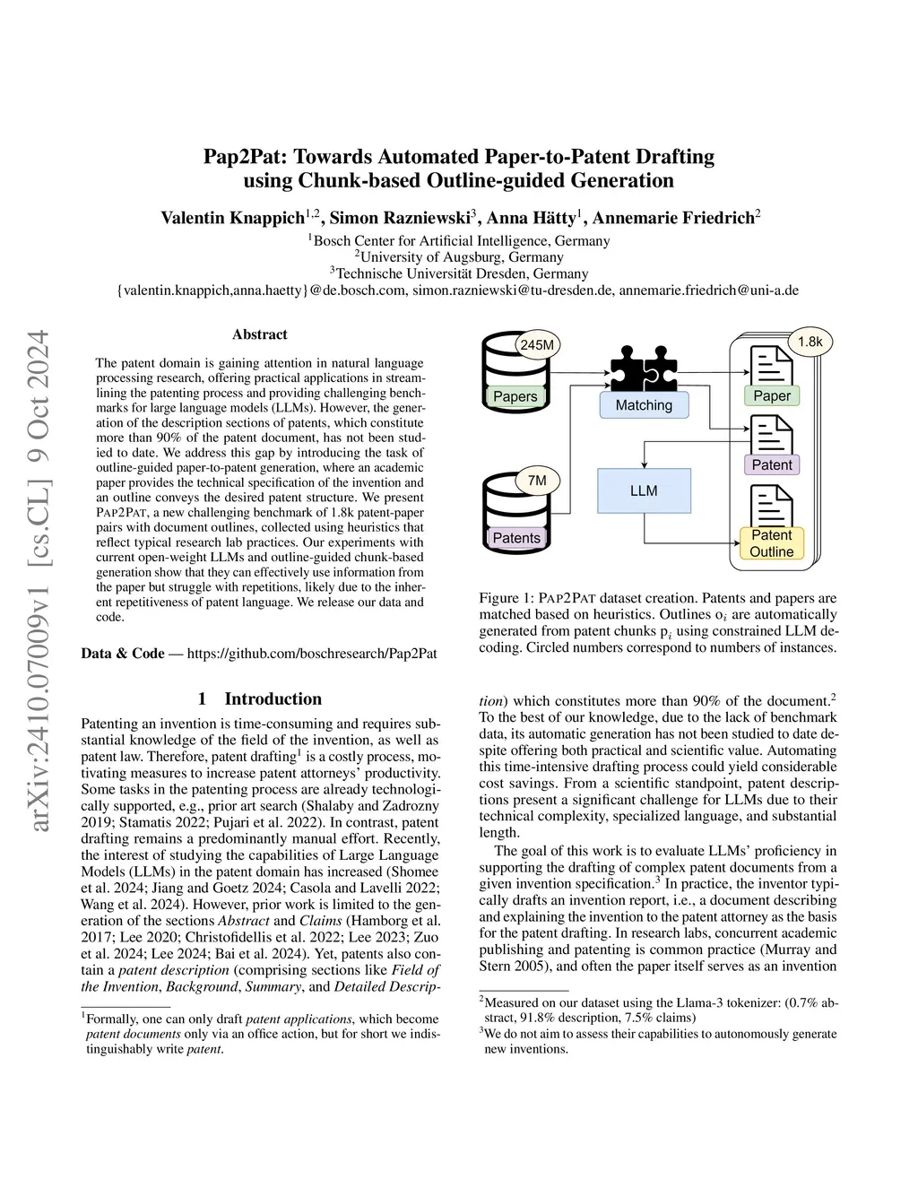Dealing with long and highly complex technical text is a challenge for Large Language Models (LLMs), which still have to unfold their potential in supporting expensive and timeintensive processes like patent drafting. Within patents, the description constitutes more than 90% of the document on average. Yet, its automatic generation remains understudied. When drafting patent applications, patent attorneys typically receive invention reports (IRs), which are usually confidential, hindering research on LLM-supported patent drafting. Often, prepublication research papers serve as IRs. We leverage this duality to build PAP2PAT, an open and realistic benchmark for patent drafting consisting of 1.8k patent-paper pairs describing the same inventions. To address the complex longdocument patent generation task, we propose chunk-based outline-guided generation using the research paper as invention specification. Our extensive evaluation using PAP2PAT and a human case study show that LLMs can effectively leverage information from the paper, but still struggle to provide the necessary level of detail. Fine-tuning leads to more patent-style language, but also to more hallucination. We release our data and codethis https URL.