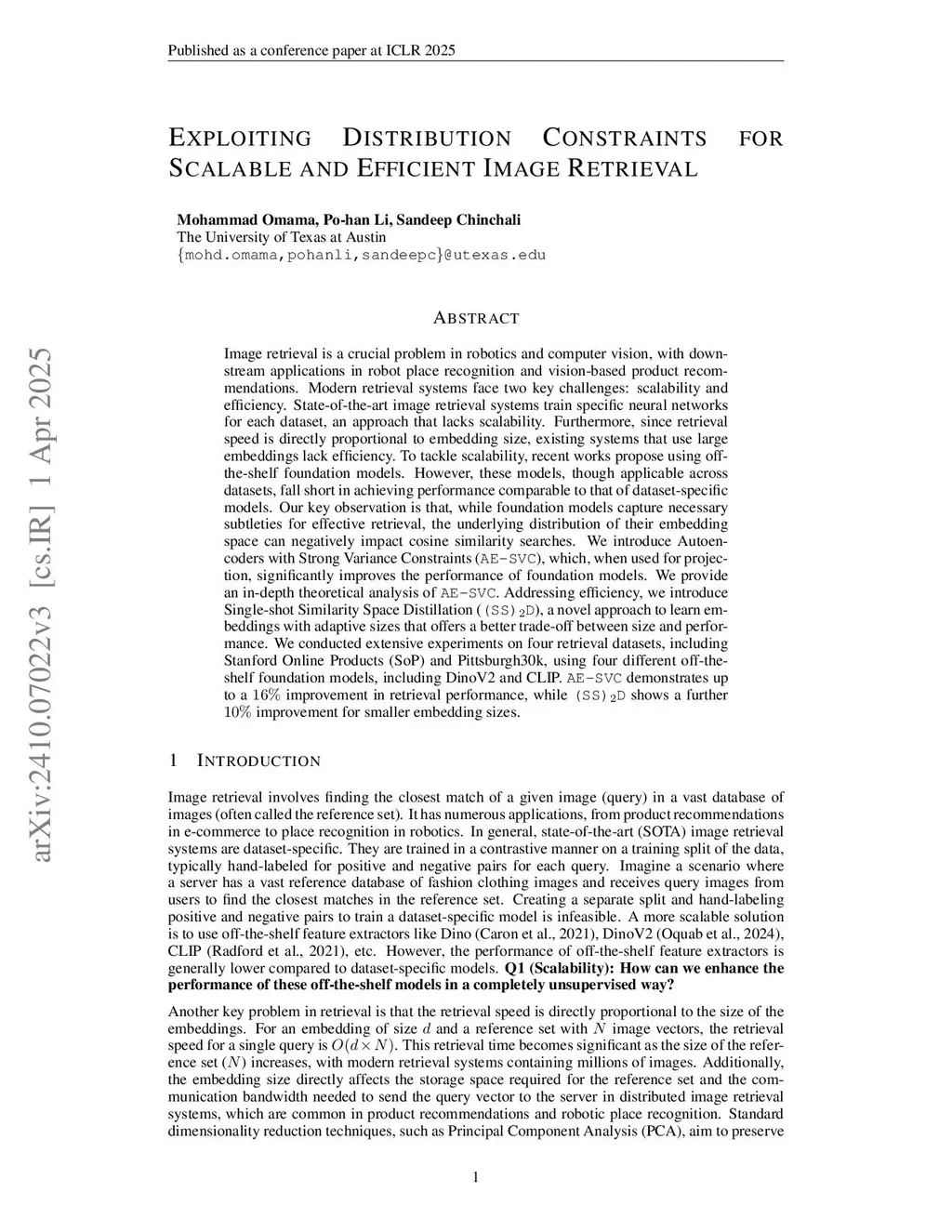 Image retrieval is crucial in robotics and computer vision, with downstream applications in robot place recognition and vision-based product recommendations. Modern retrieval systems face two key challenges: scalability and efficiency. State-of-the-art image retrieval systems train specific neural networks for each dataset, an approach that lacks scalability. Furthermore, since retrieval speed is directly proportional to embedding size, existing systems that use large embeddings lack efficiency. To tackle scalability, recent works propose using off-the-shelf foundation models. However, these models, though applicable across datasets, fall short in achieving performance comparable to that of dataset-specific models. Our key observation is that, while foundation models capture necessary subtleties for effective retrieval, the underlying distribution of their embedding space can negatively impact cosine similarity searches. We introduce Autoencoders with Strong Variance Constraints (AE-SVC), which, when used for projection, significantly improves the performance of foundation models. We provide an in-depth theoretical analysis of AE-SVC. Addressing efficiency, we introduce Single-shot Similarity Space Distillation ((SS)D), a novel approach to learn embeddings with adaptive sizes that offers a better trade-off between size and performance. We conducted extensive experiments on four retrieval datasets, including Stanford Online Products (SoP) and Pittsburgh30k, using four different off-the-shelf foundation models, including DinoV2 and CLIP. AE-SVC demonstrates up to a improvement in retrieval performance, while (SS)D shows a further improvement for smaller embedding sizes.