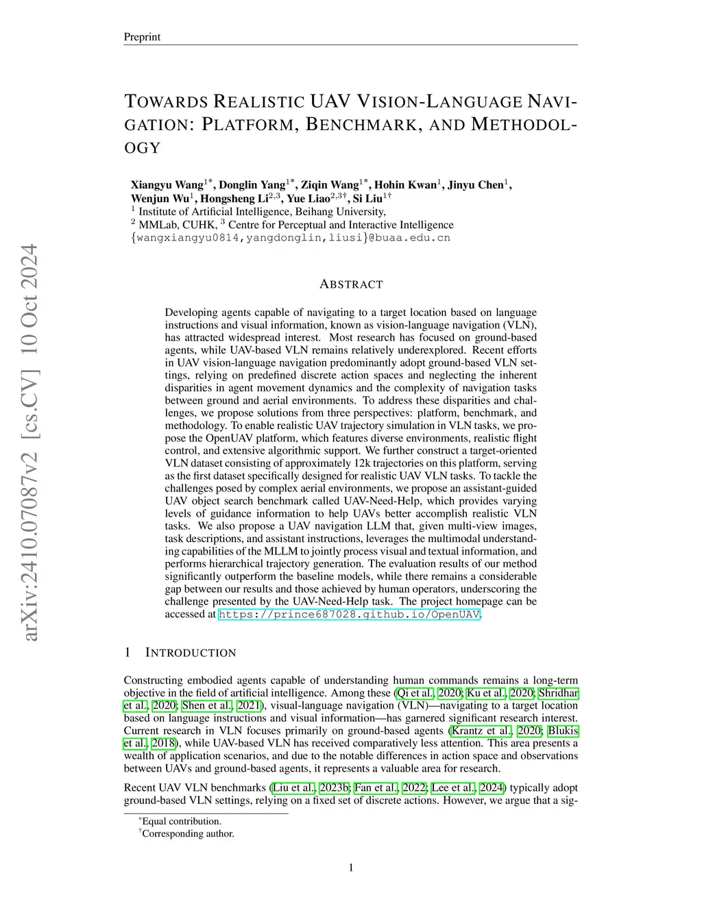 Developing agents capable of navigating to a target location based on language instructions and visual information, known as vision-language navigation (VLN), has attracted widespread interest. Most research has focused on ground-based agents, while UAV-based VLN remains relatively underexplored. Recent efforts in UAV vision-language navigation predominantly adopt ground-based VLN settings, relying on predefined discrete action spaces and neglecting the inherent disparities in agent movement dynamics and the complexity of navigation tasks between ground and aerial environments. To address these disparities and challenges, we propose solutions from three perspectives: platform, benchmark, and methodology. To enable realistic UAV trajectory simulation in VLN tasks, we propose the OpenUAV platform, which features diverse environments, realistic flight control, and extensive algorithmic support. We further construct a target-oriented VLN dataset consisting of approximately 12k trajectories on this platform, serving as the first dataset specifically designed for realistic UAV VLN tasks. To tackle the challenges posed by complex aerial environments, we propose an assistant-guided UAV object search benchmark called UAV-Need-Help, which provides varying levels of guidance information to help UAVs better accomplish realistic VLN tasks. We also propose a UAV navigation LLM that, given multi-view images, task descriptions, and assistant instructions, leverages the multimodal understanding capabilities of the MLLM to jointly process visual and textual information, and performs hierarchical trajectory generation. The evaluation results of our method significantly outperform the baseline models, while there remains a considerable gap between our results and those achieved by human operators, underscoring the challenge presented by the UAV-Need-Help task.