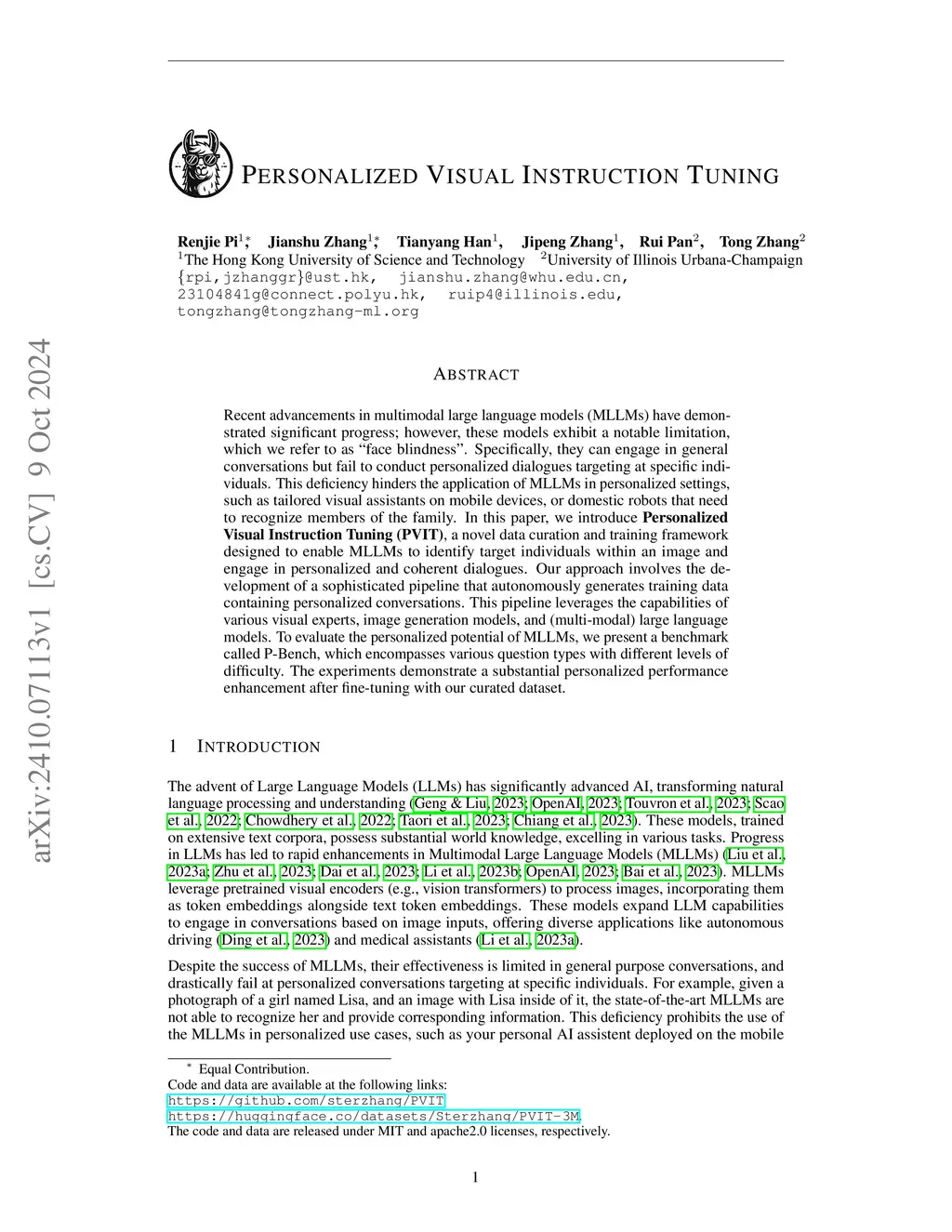 Recent advancements in multimodal large language models (MLLMs) have demonstrated significant progress; however, these models exhibit a notable limitation, which we refer to as "face blindness". Specifically, they can engage in general conversations but fail to conduct personalized dialogues targeting at specific individuals. This deficiency hinders the application of MLLMs in personalized settings, such as tailored visual assistants on mobile devices, or domestic robots that need to recognize members of the family. In this paper, we introduce Personalized Visual Instruction Tuning (PVIT), a novel data curation and training framework designed to enable MLLMs to identify target individuals within an image and engage in personalized and coherent dialogues. Our approach involves the development of a sophisticated pipeline that autonomously generates training data containing personalized conversations. This pipeline leverages the capabilities of various visual experts, image generation models, and (multi-modal) large language models. To evaluate the personalized potential of MLLMs, we present a benchmark called P-Bench, which encompasses various question types with different levels of difficulty. The experiments demonstrate a substantial personalized performance enhancement after fine-tuning with our curated dataset.