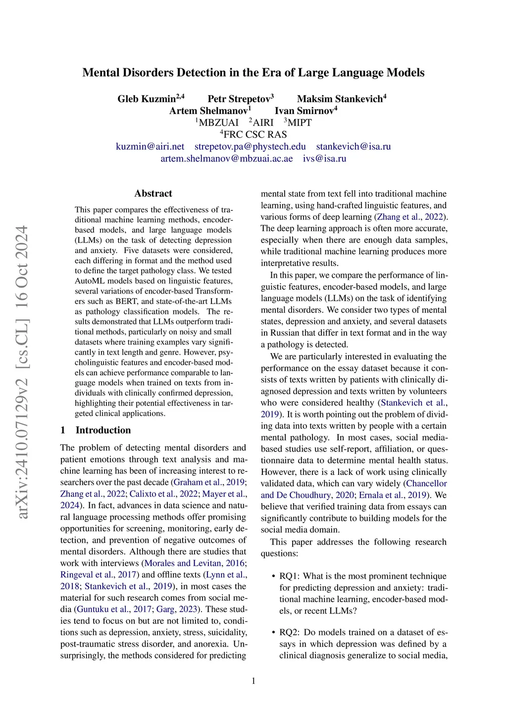 This paper compares the effectiveness of traditional machine learning methods, encoder-based models, and large language models (LLMs) on the task of detecting depression and anxiety. Five Russian-language datasets were considered, each differing in format and in the method used to define the target pathology class. We tested AutoML models based on linguistic features, several variations of encoder-based Transformers such as BERT, and state-of-the-art LLMs as pathology classification models. The results demonstrated that LLMs outperform traditional methods, particularly on noisy and small datasets where training examples vary significantly in text length and genre. However, psycholinguistic features and encoder-based models can achieve performance comparable to language models when trained on texts from individuals with clinically confirmed depression, highlighting their potential effectiveness in targeted clinical applications.