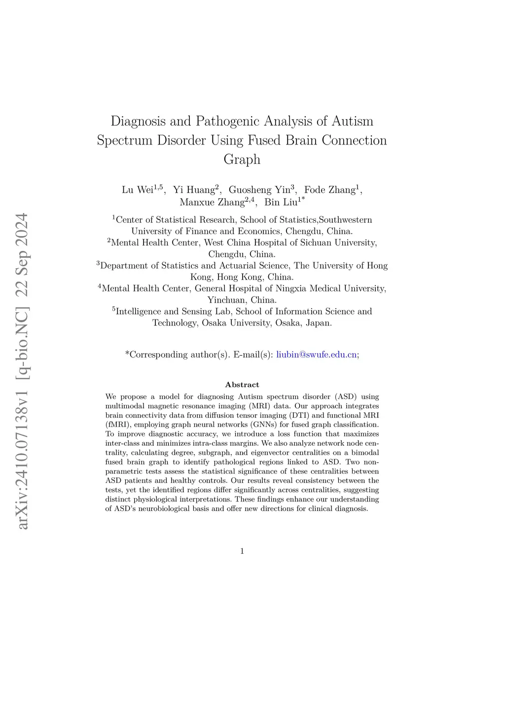 We propose a model for diagnosing Autism spectrum disorder (ASD) using multimodal magnetic resonance imaging (MRI) data. Our approach integrates brain connectivity data from diffusion tensor imaging (DTI) and functional MRI (fMRI), employing graph neural networks (GNNs) for fused graph classification. To improve diagnostic accuracy, we introduce a loss function that maximizes inter-class and minimizes intra-class margins. We also analyze network node centrality, calculating degree, subgraph, and eigenvector centralities on a bimodal fused brain graph to identify pathological regions linked to ASD. Two non-parametric tests assess the statistical significance of these centralities between ASD patients and healthy controls. Our results reveal consistency between the tests, yet the identified regions differ significantly across centralities, suggesting distinct physiological interpretations. These findings enhance our understanding of ASD's neurobiological basis and offer new directions for clinical diagnosis.