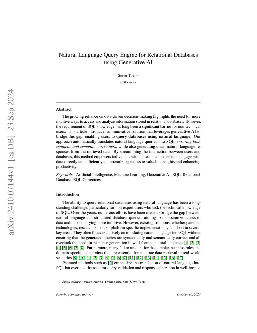 Natural Language Query Engine for Relational Databases using Generative