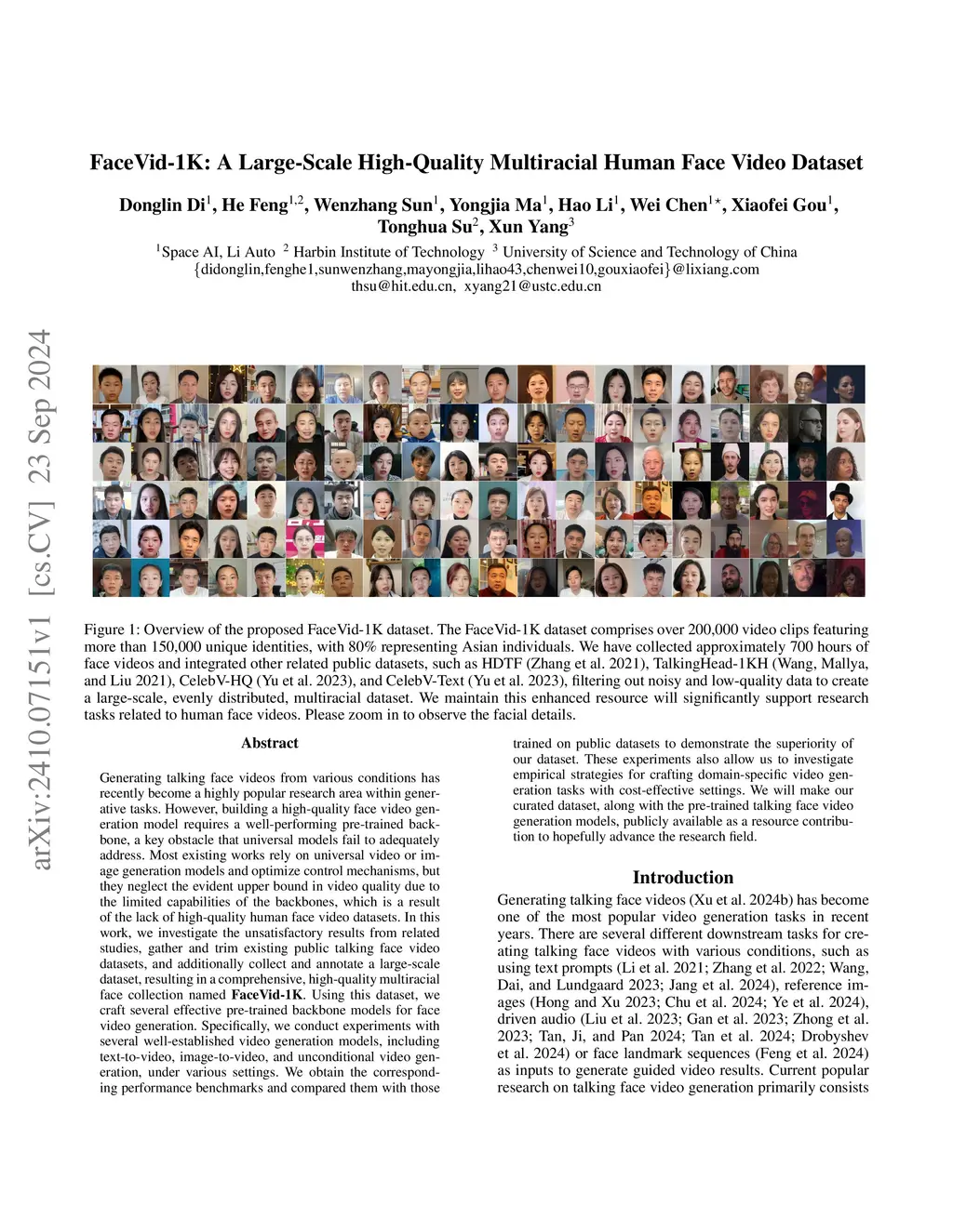 Human-centric generative models are becoming increasingly popular, giving rise to various innovative tools and applications, such as talking face videos conditioned on text or audio prompts. The core of these capabilities lies in powerful pre-trained foundation models, trained on large-scale, high-quality datasets. However, many advanced methods rely on in-house data subject to various constraints, and other current studies fail to generate high-resolution face videos, which is mainly attributed to the significant lack of large-scale, high-quality face video datasets. In this paper, we introduce a human face video dataset, \textbf{DH-FaceVid-1K}. Our collection spans 1,200 hours in total, encompassing 270,043 video clips from over 20,000 individuals. Each sample includes corresponding speech audio, facial keypoints, and text annotations. Compared to other publicly available datasets, ours distinguishes itself through its multi-ethnic coverage and high-quality, comprehensive individual attributes. We establish multiple face video generation models supporting tasks such as text-to-video and image-to-video generation. In addition, we develop comprehensive benchmarks to validate the scaling law when using different proportions of proposed dataset. Our primary aim is to contribute a face video dataset, particularly addressing the underrepresentation of Asian faces in existing curated datasets and thereby enriching the global spectrum of face-centric data and mitigating demographic biases. \textbf{Project Page:}this https URL