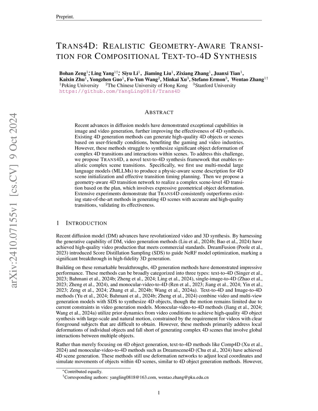 Recent advances in diffusion models have demonstrated exceptional capabilities in image and video generation, further improving the effectiveness of 4D synthesis. Existing 4D generation methods can generate high-quality 4D objects or scenes based on user-friendly conditions, benefiting the gaming and video industries. However, these methods struggle to synthesize significant object deformation of complex 4D transitions and interactions within scenes. To address this challenge, we propose Trans4D, a novel text-to-4D synthesis framework that enables realistic complex scene transitions. Specifically, we first use multi-modal large language models (MLLMs) to produce a physic-aware scene description for 4D scene initialization and effective transition timing planning. Then we propose a geometry-aware 4D transition network to realize a complex scene-level 4D transition based on the plan, which involves expressive geometrical object deformation. Extensive experiments demonstrate that Trans4D consistently outperforms existing state-of-the-art methods in generating 4D scenes with accurate and high-quality transitions, validating its effectiveness. Code: https://github.com/YangLing0818/Trans4D