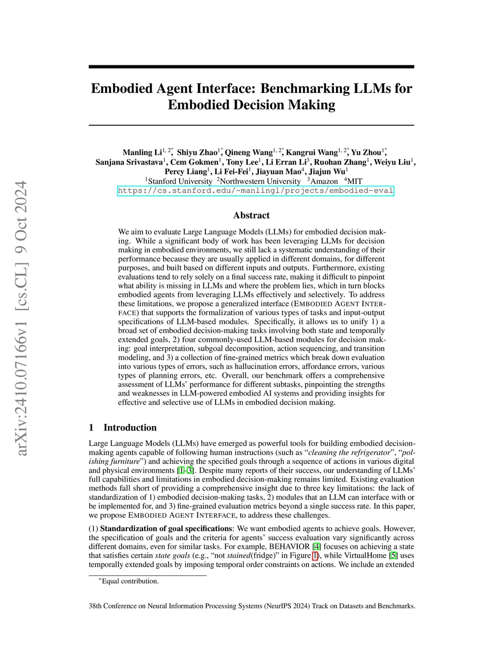 Embodied Agent Interface: Benchmarking LLMs for Embodied Decision Making