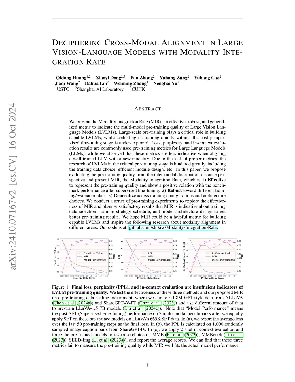 We present the Modality Integration Rate (MIR), an effective, robust, and generalized metric to indicate the multi-modal pre-training quality of Large Vision Language Models (LVLMs). Large-scale pre-training plays a critical role in building capable LVLMs, while evaluating its training quality without the costly supervised fine-tuning stage is under-explored. Loss, perplexity, and in-context evaluation results are commonly used pre-training metrics for Large Language Models (LLMs), while we observed that these metrics are less indicative when aligning a well-trained LLM with a new modality. Due to the lack of proper metrics, the research of LVLMs in the critical pre-training stage is hindered greatly, including the training data choice, efficient module design, etc. In this paper, we propose evaluating the pre-training quality from the inter-modal distribution distance perspective and present MIR, the Modality Integration Rate, which is 1) \textbf{Effective} to represent the pre-training quality and show a positive relation with the benchmark performance after supervised fine-tuning. 2) \textbf{Robust} toward different training/evaluation data. 3) \textbf{Generalize} across training configurations and architecture choices. We conduct a series of pre-training experiments to explore the effectiveness of MIR and observe satisfactory results that MIR is indicative about training data selection, training strategy schedule, and model architecture design to get better pre-training results. We hope MIR could be a helpful metric for building capable LVLMs and inspire the following research about modality alignment in different areas. Our code is at: https://github.com/shikiw/Modality-Integration-Rate.