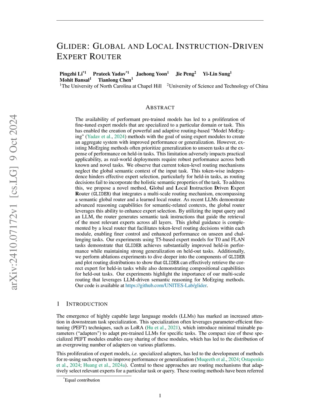 The availability of performant pre-trained models has led to a proliferation of fine-tuned expert models that are specialized to particular domains. This has enabled the creation of powerful and adaptive routing-based "Model MoErging" methods with the goal of using expert modules to create an aggregate system with improved performance or generalization. However, existing MoErging methods often prioritize generalization to unseen tasks at the expense of performance on held-in tasks, which limits its practical applicability in real-world deployment scenarios. We observe that current token-level routing mechanisms neglect the global semantic context of the input task. This token-wise independence hinders effective expert selection for held-in tasks, as routing decisions fail to incorporate the semantic properties of the task. To address this, we propose, Global and Local Instruction Driven Expert Router (GLIDER) that integrates a multi-scale routing mechanism, encompassing a semantic global router and a learned local router. The global router leverages LLM's advanced reasoning capabilities for semantic-related contexts to enhance expert selection. Given the input query and LLM, the router generates semantic task instructions that guide the retrieval of the most relevant experts across all layers. This global guidance is complemented by a local router that facilitates token-level routing decisions within each module, enabling finer control and enhanced performance on unseen tasks. Our experiments using T5-based models for T0 and FLAN tasks demonstrate that GLIDER achieves substantially improved held-in performance while maintaining strong generalization on held-out tasks. We also perform ablations experiments to dive deeper into the components of GLIDER. Our experiments highlight the importance of our multi-scale routing that leverages LLM-driven semantic reasoning for MoErging methods.