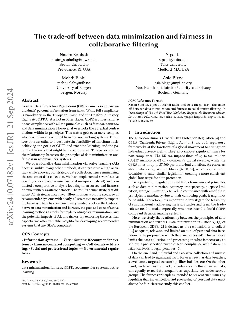 General Data Protection Regulations (GDPR) aim to safeguard individuals' personal information from harm. While full compliance is mandatory in the European Union and the California Privacy Rights Act (CPRA), it is not in other places. GDPR requires simultaneous compliance with all the principles such as fairness, accuracy, and data minimization. However, it overlooks the potential contradictions within its principles. This matter gets even more complex when compliance is required from decision-making systems. Therefore, it is essential to investigate the feasibility of simultaneously achieving the goals of GDPR and machine learning, and the potential tradeoffs that might be forced upon us. This paper studies the relationship between the principles of data minimization and fairness in recommender systems. We operationalize data minimization via active learning (AL) because, unlike many other methods, it can preserve a high accuracy while allowing for strategic data collection, hence minimizing the amount of data collection. We have implemented several active learning strategies (personalized and non-personalized) and conducted a comparative analysis focusing on accuracy and fairness on two publicly available datasets. The results demonstrate that different AL strategies may have different impacts on the accuracy of recommender systems with nearly all strategies negatively impacting fairness. There has been no to very limited work on the trade-off between data minimization and fairness, the pros and cons of active learning methods as tools for implementing data minimization, and the potential impacts of AL on fairness. By exploring these critical aspects, we offer valuable insights for developing recommender systems that are GDPR compliant.