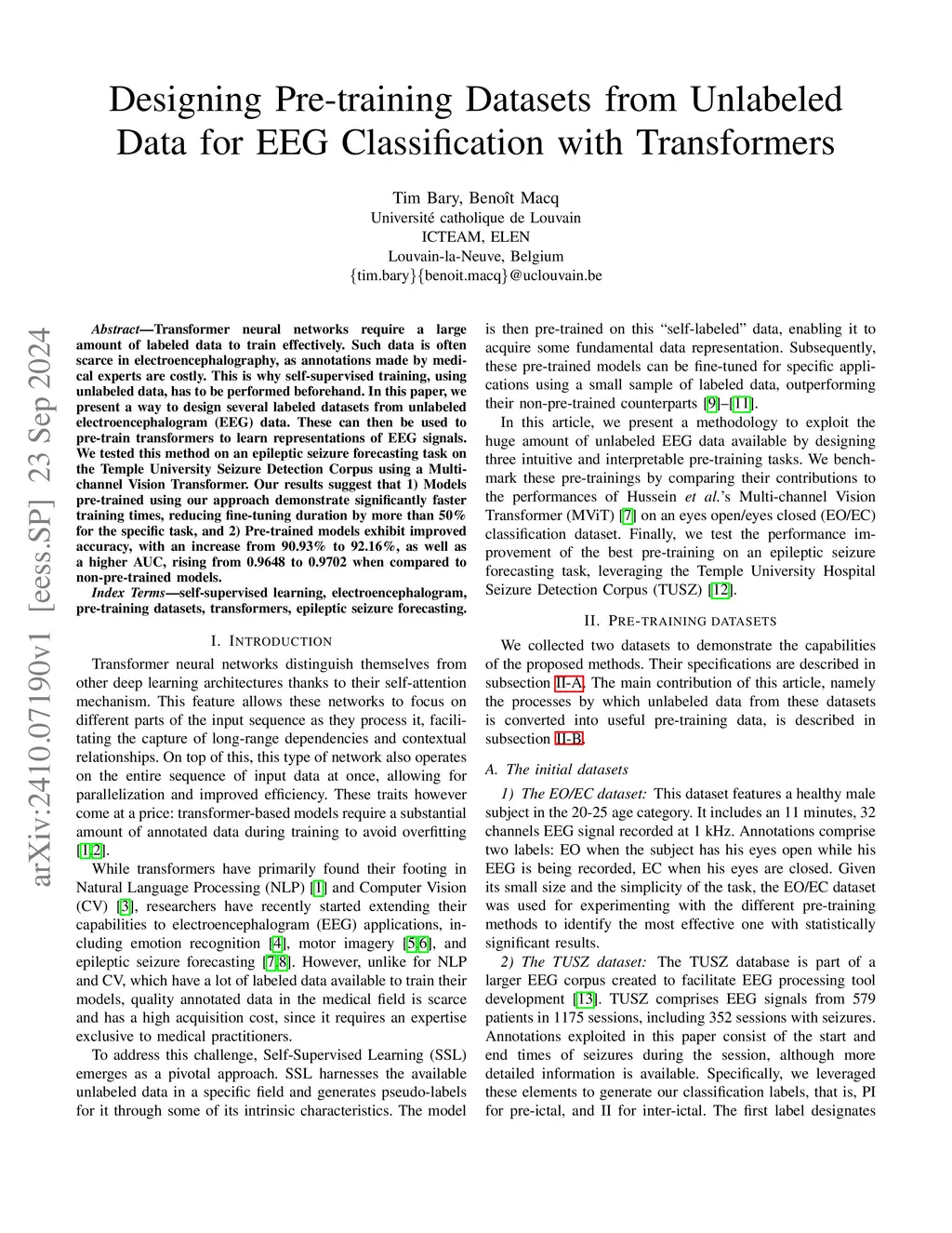 Transformer neural networks require a large amount of labeled data to train effectively. Such data is often scarce in electroencephalography, as annotations made by medical experts are costly. This is why self-supervised training, using unlabeled data, has to be performed beforehand. In this paper, we present a way to design several labeled datasets from unlabeled electroencephalogram (EEG) data. These can then be used to pre-train transformers to learn representations of EEG signals. We tested this method on an epileptic seizure forecasting task on the Temple University Seizure Detection Corpus using a Multi-channel Vision Transformer. Our results suggest that 1) Models pre-trained using our approach demonstrate significantly faster training times, reducing fine-tuning duration by more than 50% for the specific task, and 2) Pre-trained models exhibit improved accuracy, with an increase from 90.93% to 92.16%, as well as a higher AUC, rising from 0.9648 to 0.9702 when compared to non-pre-trained models.