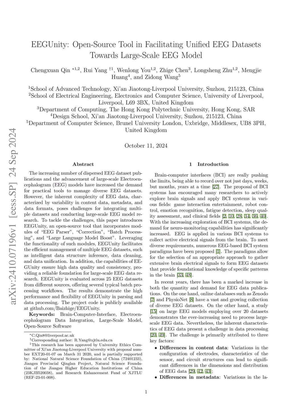 The increasing number of dispersed EEG dataset publications and the advancement of large-scale Electroencephalogram (EEG) models have increased the demand for practical tools to manage diverse EEG datasets. However, the inherent complexity of EEG data, characterized by variability in content data, metadata, and data formats, poses challenges for integrating multiple datasets and conducting large-scale EEG model research. To tackle the challenges, this paper introduces EEGUnity, an open-source tool that incorporates modules of ÉEG Parser', 'Correction', 'Batch Processing', and 'Large Language Model Boost'. Leveraging the functionality of such modules, EEGUnity facilitates the efficient management of multiple EEG datasets, such as intelligent data structure inference, data cleaning, and data unification. In addition, the capabilities of EEGUnity ensure high data quality and consistency, providing a reliable foundation for large-scale EEG data research. EEGUnity is evaluated across 25 EEG datasets from different sources, offering several typical batch processing workflows. The results demonstrate the high performance and flexibility of EEGUnity in parsing and data processing. The project code is publicly available at github.com/Baizhige/EEGUnity.