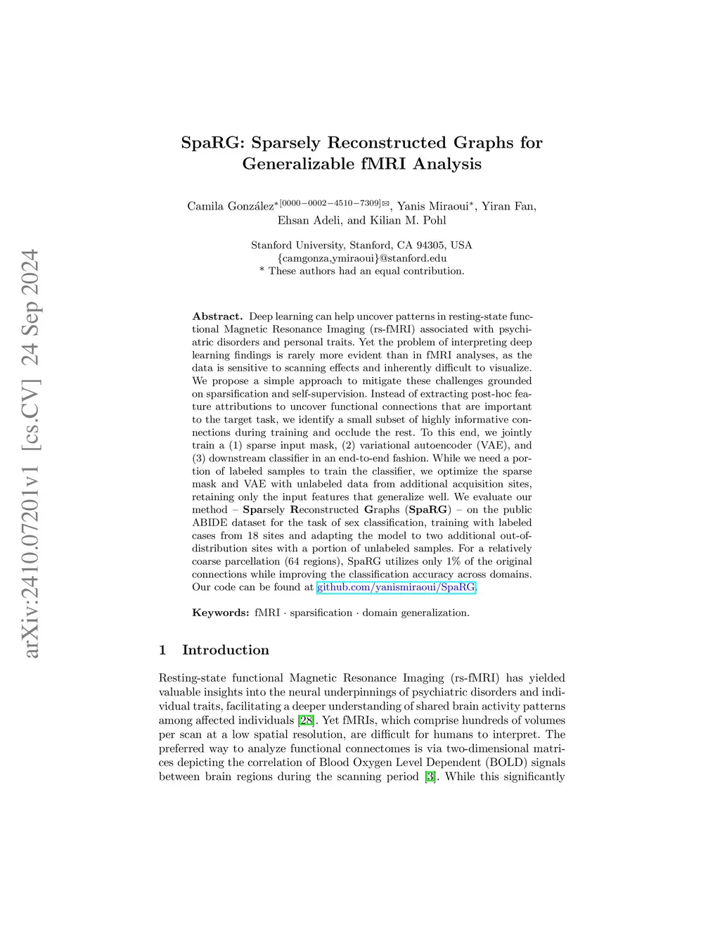 SpaRG: Sparsely Reconstructed Graphs for Generalizable fMRI Analysis