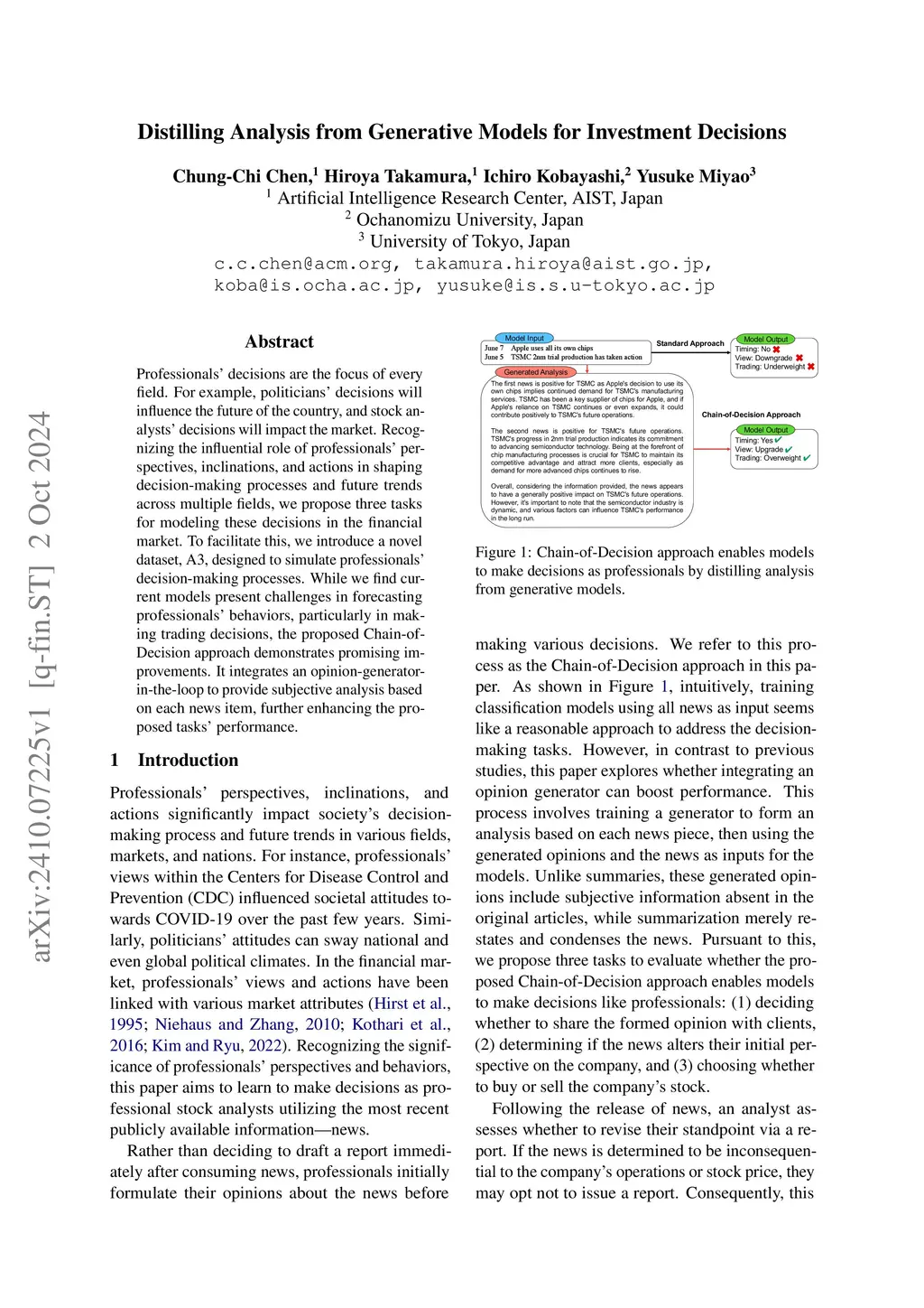 Professionals' decisions are the focus of every field. For example, politicians' decisions will influence the future of the country, and stock analysts' decisions will impact the market. Recognizing the influential role of professionals' perspectives, inclinations, and actions in shaping decision-making processes and future trends across multiple fields, we propose three tasks for modeling these decisions in the financial market. To facilitate this, we introduce a novel dataset, A3, designed to simulate professionals' decision-making processes. While we find current models present challenges in forecasting professionals' behaviors, particularly in making trading decisions, the proposed Chain-of-Decision approach demonstrates promising improvements. It integrates an opinion-generator-in-the-loop to provide subjective analysis based on each news item, further enhancing the proposed tasks' performance.