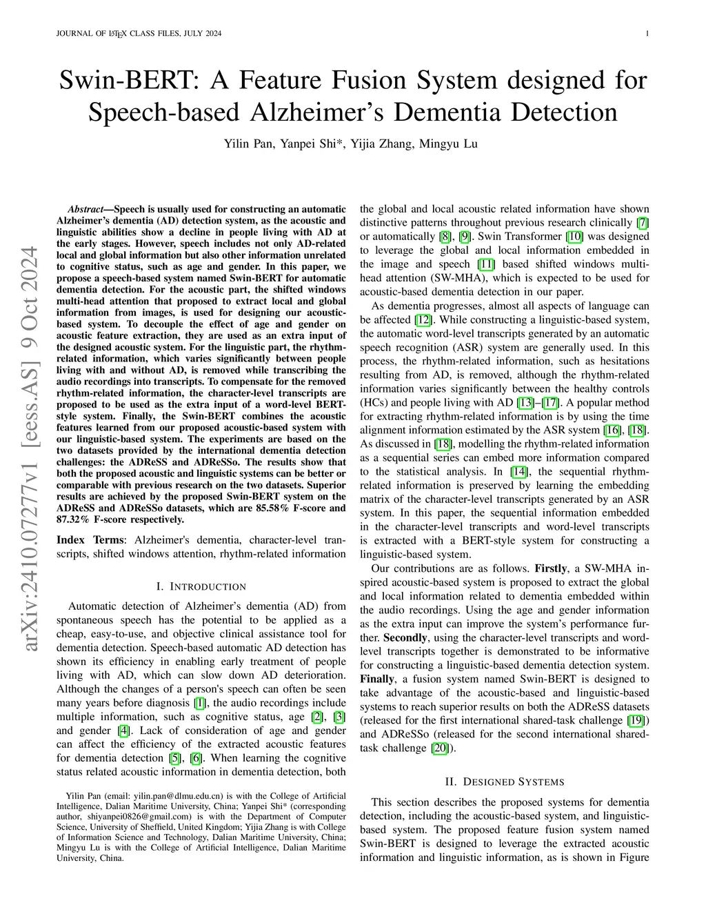 Swin-BERT: A Feature Fusion System designed for Speech-based Alzheimer's