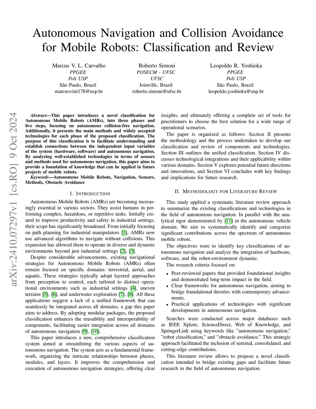 This paper introduces a novel classification for Autonomous Mobile Robots (AMRs), into three phases and five steps, focusing on autonomous collision-free navigation. Additionally, it presents the main methods and widely accepted technologies for each phase of the proposed classification. The purpose of this classification is to facilitate understanding and establish connections between the independent input variables of the system (hardware, software) and autonomous navigation. By analyzing well-established technologies in terms of sensors and methods used for autonomous navigation, this paper aims to provide a foundation of knowledge that can be applied in future projects of mobile robots.