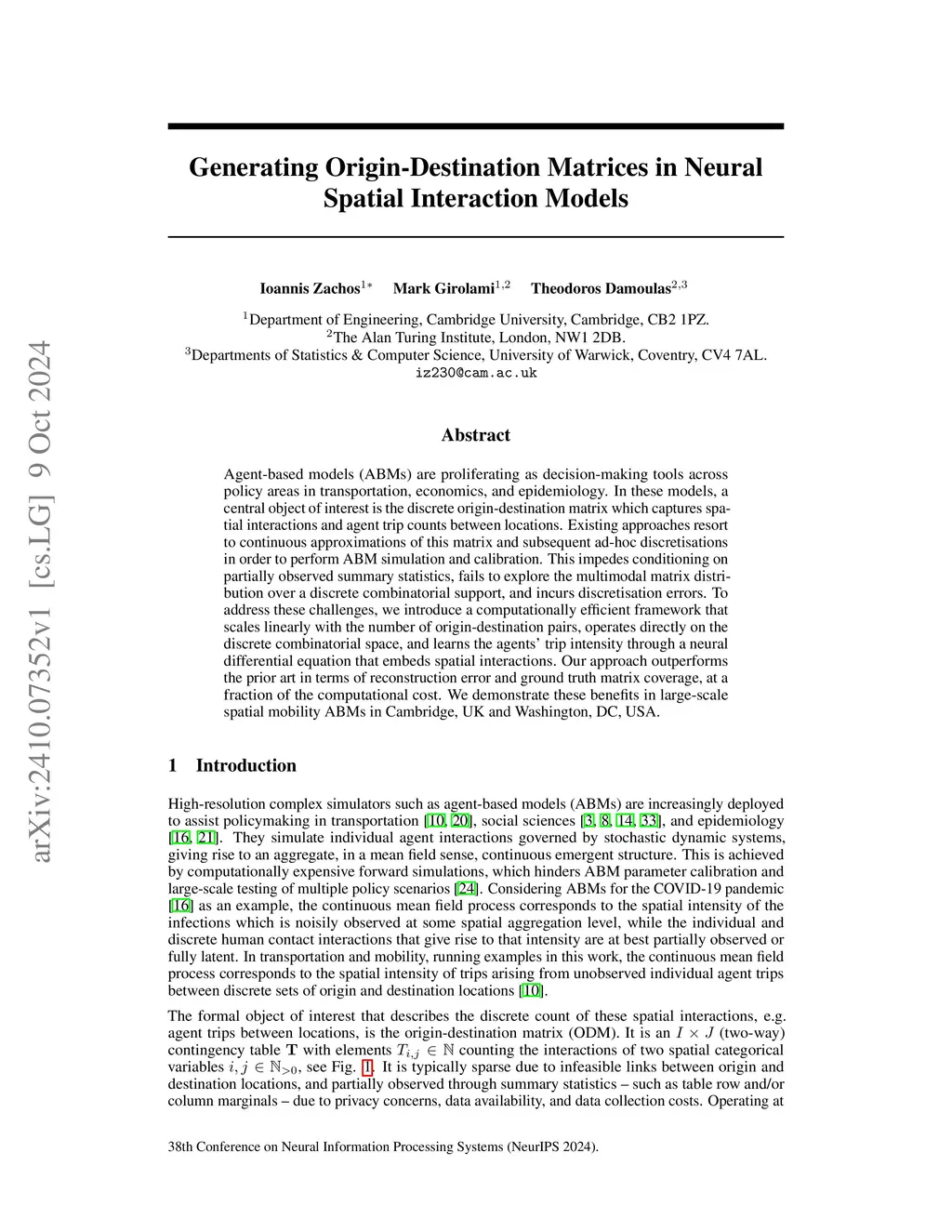 Agent-based models (ABMs) are proliferating as decision-making tools across policy areas in transportation, economics, and epidemiology. In these models, a central object of interest is the discrete origin-destination matrix which captures spatial interactions and agent trip counts between locations. Existing approaches resort to continuous approximations of this matrix and subsequent ad-hoc discretisations in order to perform ABM simulation and calibration. This impedes conditioning on partially observed summary statistics, fails to explore the multimodal matrix distribution over a discrete combinatorial support, and incurs discretisation errors. To address these challenges, we introduce a computationally efficient framework that scales linearly with the number of origin-destination pairs, operates directly on the discrete combinatorial space, and learns the agents' trip intensity through a neural differential equation that embeds spatial interactions. Our approach outperforms the prior art in terms of reconstruction error and ground truth matrix coverage, at a fraction of the computational cost. We demonstrate these benefits in large-scale spatial mobility ABMs in Cambridge, UK and Washington, DC, USA.