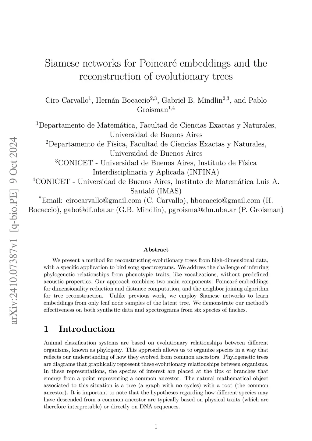 We present a method for reconstructing evolutionary trees from high-dimensional data, with a specific application to bird song spectrograms. We address the challenge of inferring phylogenetic relationships from phenotypic traits, like vocalizations, without predefined acoustic properties. Our approach combines two main components: Poincar\é embeddings for dimensionality reduction and distance computation, and the neighbor joining algorithm for tree reconstruction. Unlike previous work, we employ Siamese networks to learn embeddings from only leaf node samples of the latent tree. We demonstrate our method's effectiveness on both synthetic data and spectrograms from six species of finches.