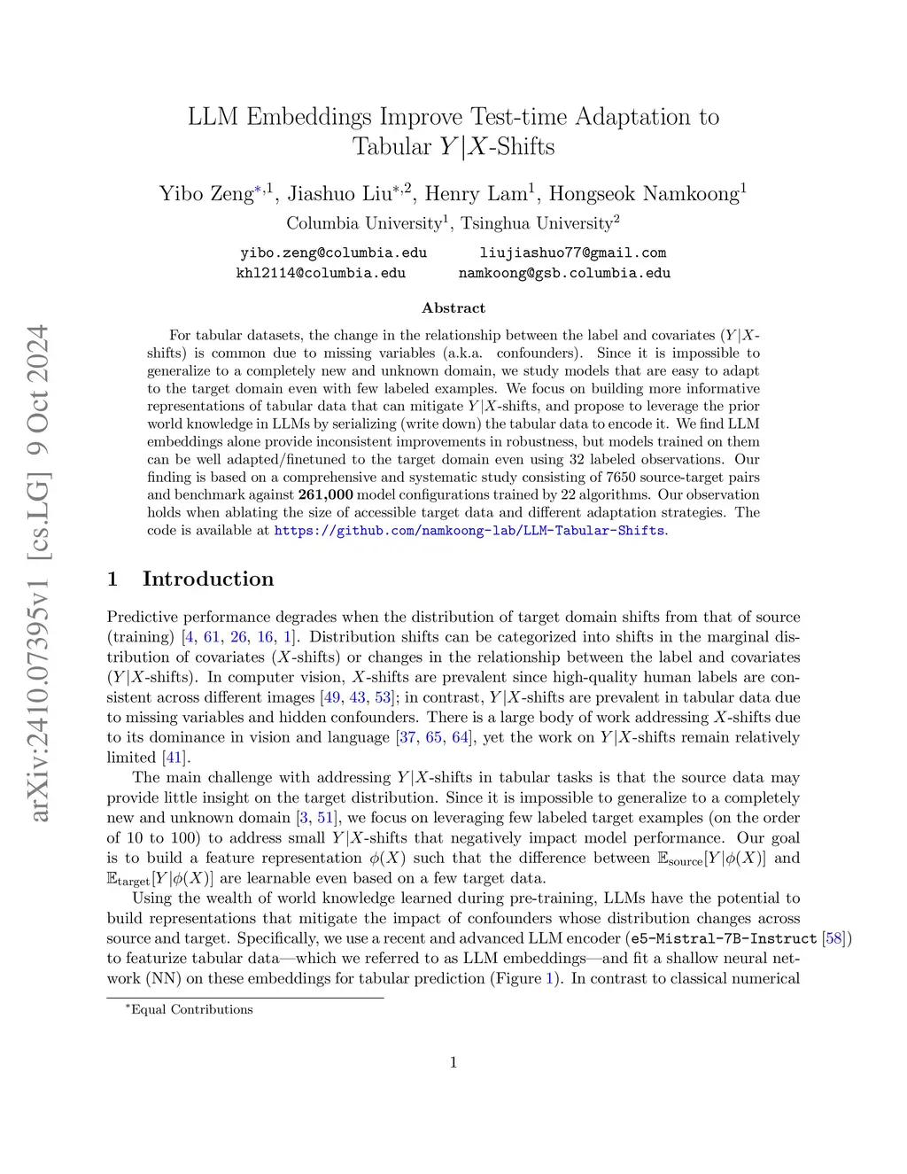 For tabular datasets, the change in the relationship between the label and covariates (-shifts) is common due to missing variables (a.k.a. confounders). Since it is impossible to generalize to a completely new and unknown domain, we study models that are easy to adapt to the target domain even with few labeled examples. We focus on building more informative representations of tabular data that can mitigate -shifts, and propose to leverage the prior world knowledge in LLMs by serializing (write down) the tabular data to encode it. We find LLM embeddings alone provide inconsistent improvements in robustness, but models trained on them can be well adapted/finetuned to the target domain even using 32 labeled observations. Our finding is based on a comprehensive and systematic study consisting of 7650 source-target pairs and benchmark against 261,000 model configurations trained by 22 algorithms. Our observation holds when ablating the size of accessible target data and different adaptation strategies. The code is available at https://github.com/namkoong-lab/LLM-Tabular-Shifts.
