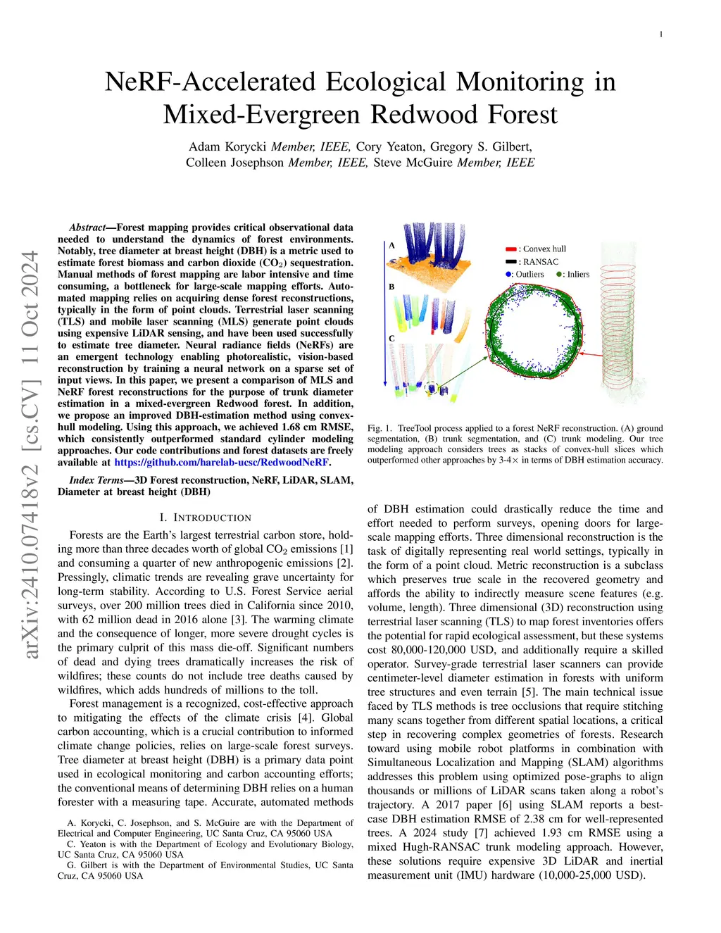 Forest mapping provides critical observational data needed to understand the dynamics of forest environments. Notably, tree diameter at breast height (DBH) is a metric used to estimate forest biomass and carbon dioxide sequestration. Manual methods of forest mapping are labor intensive and time consuming, a bottleneck for large-scale mapping efforts. Automated mapping relies on acquiring dense forest reconstructions, typically in the form of point clouds. Terrestrial laser scanning (TLS) and mobile laser scanning (MLS) generate point clouds using expensive LiDAR sensing, and have been used successfully to estimate tree diameter. Neural radiance fields (NeRFs) are an emergent technology enabling photorealistic, vision-based reconstruction by training a neural network on a sparse set of input views. In this paper, we present a comparison of MLS and NeRF forest reconstructions for the purpose of trunk diameter estimation in a mixed-evergreen Redwood forest. In addition, we propose an improved DBH-estimation method using convex-hull modeling. Using this approach, we achieved 1.68 cm RMSE, which consistently outperformed standard cylinder modeling approaches. Our code contributions and forest datasets are freely available at https://github.com/harelab-ucsc/RedwoodNeRF.