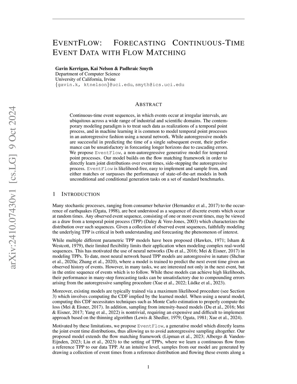 Continuous-time event sequences, in which events occur at irregular intervals, are ubiquitous across a wide range of industrial and scientific domains. The contemporary modeling paradigm is to treat such data as realizations of a temporal point process, and in machine learning it is common to model temporal point processes in an autoregressive fashion using a neural network. While autoregressive models are successful in predicting the time of a single subsequent event, their performance can degrade when forecasting longer horizons due to cascading errors and myopic predictions. We propose EventFlow, a non-autoregressive generative model for temporal point processes. The model builds on the flow matching framework in order to directly learn joint distributions over event times, side-stepping the autoregressive process. EventFlow is simple to implement and achieves a 20%-53% lower error than the nearest baseline on standard TPP benchmarks while simultaneously using fewer model calls at sampling time.