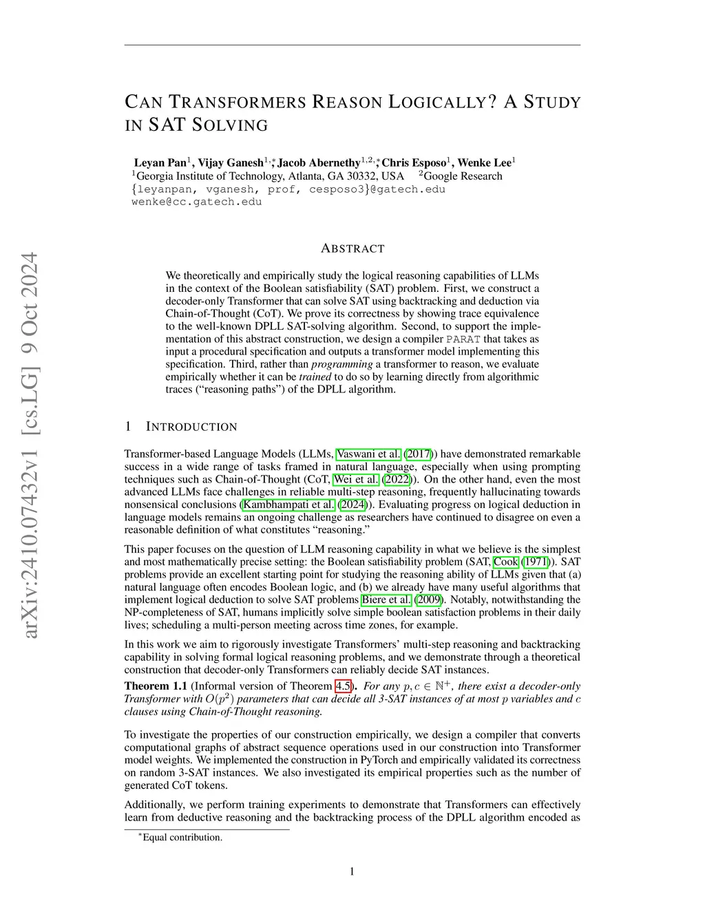 We formally study the logical reasoning capabilities of decoder-only Transformers in the context of the boolean satisfiability (SAT) problem. First, we prove by construction that decoder-only Transformers can decide 3-SAT, in a non-uniform model of computation, using backtracking and deduction via Chain-of-Thought (CoT). %We prove its correctness by showing trace equivalence to the well-known DPLL SAT-solving algorithm. Second, we implement our construction as a PyTorch model with a tool (PARAT) that we designed to empirically demonstrate its correctness and investigate its properties. Third, rather than \textit{programming} a transformer to reason, we evaluate empirically whether it can be \textit{trained} to do so by learning directly from algorithmic traces (``reasoning paths'') from our theoretical construction. The trained models demonstrate strong out-of-distribution generalization on problem sizes seen during training but has limited length generalization, which is consistent with the implications of our theoretical result