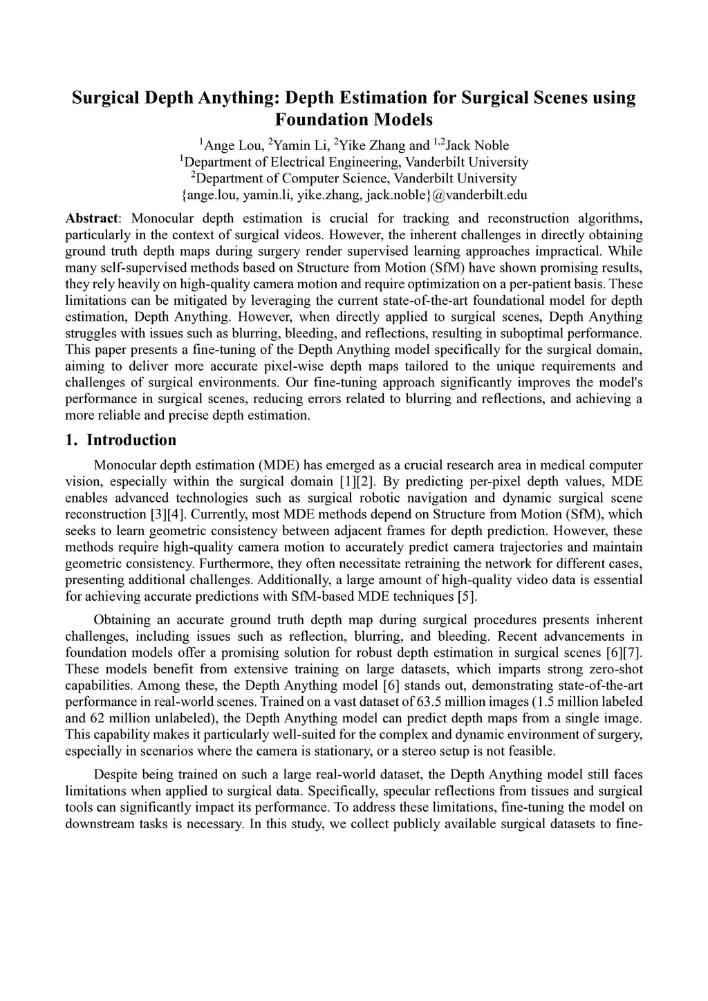 Monocular depth estimation is crucial for tracking and reconstruction algorithms, particularly in the context of surgical videos. However, the inherent challenges in directly obtaining ground truth depth maps during surgery render supervised learning approaches impractical. While many self-supervised methods based on Structure from Motion (SfM) have shown promising results, they rely heavily on high-quality camera motion and require optimization on a per-patient basis. These limitations can be mitigated by leveraging the current state-of-the-art foundational model for depth estimation, Depth Anything. However, when directly applied to surgical scenes, Depth Anything struggles with issues such as blurring, bleeding, and reflections, resulting in suboptimal performance. This paper presents a fine-tuning of the Depth Anything model specifically for the surgical domain, aiming to deliver more accurate pixel-wise depth maps tailored to the unique requirements and challenges of surgical environments. Our fine-tuning approach significantly improves the model's performance in surgical scenes, reducing errors related to blurring and reflections, and achieving a more reliable and precise depth estimation.