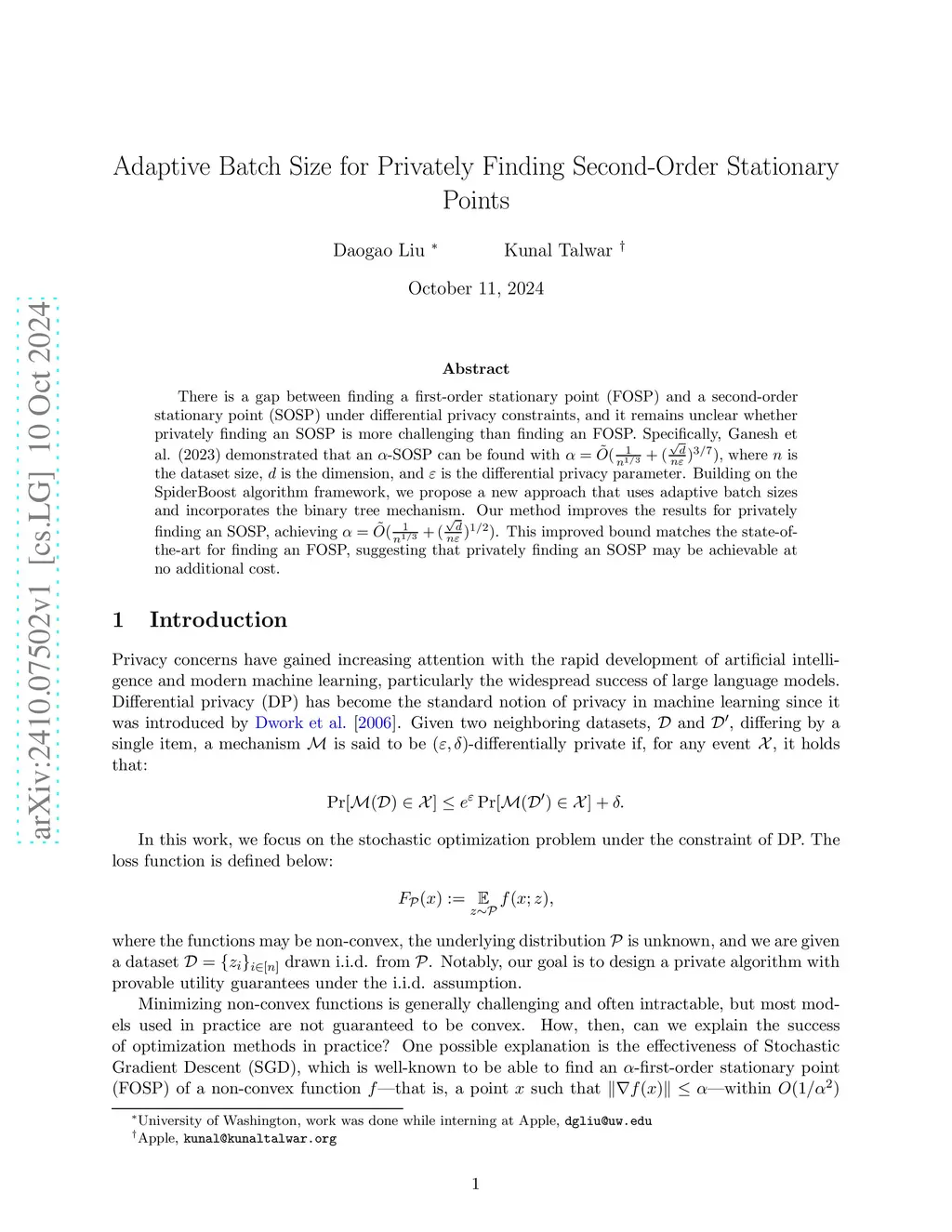 There is a gap between finding a first-order stationary point (FOSP) and a second-order stationary point (SOSP) under differential privacy constraints, and it remains unclear whether privately finding an SOSP is more challenging than finding an FOSP. Specifically, Ganesh et al. (2023) claimed that an -SOSP can be found with , where is the dataset size, is the dimension, and is the differential privacy parameter. However, a recent analysis revealed an issue in their saddle point escape procedure, leading to weaker guarantees. Building on the SpiderBoost algorithm framework, we propose a new approach that uses adaptive batch sizes and incorporates the binary tree mechanism. Our method not only corrects this issue but also improves the results for privately finding an SOSP, achieving .This improved bound matches the state-of-the-art for finding a FOSP, suggesting that privately finding an SOSP may be achievable at no additional cost.
