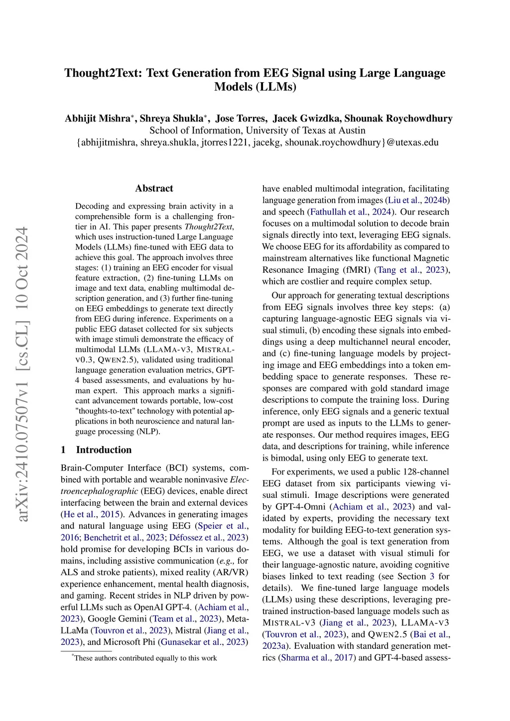 Thought2Text: Text Generation from EEG Signal using Large Language Models (LLMs)