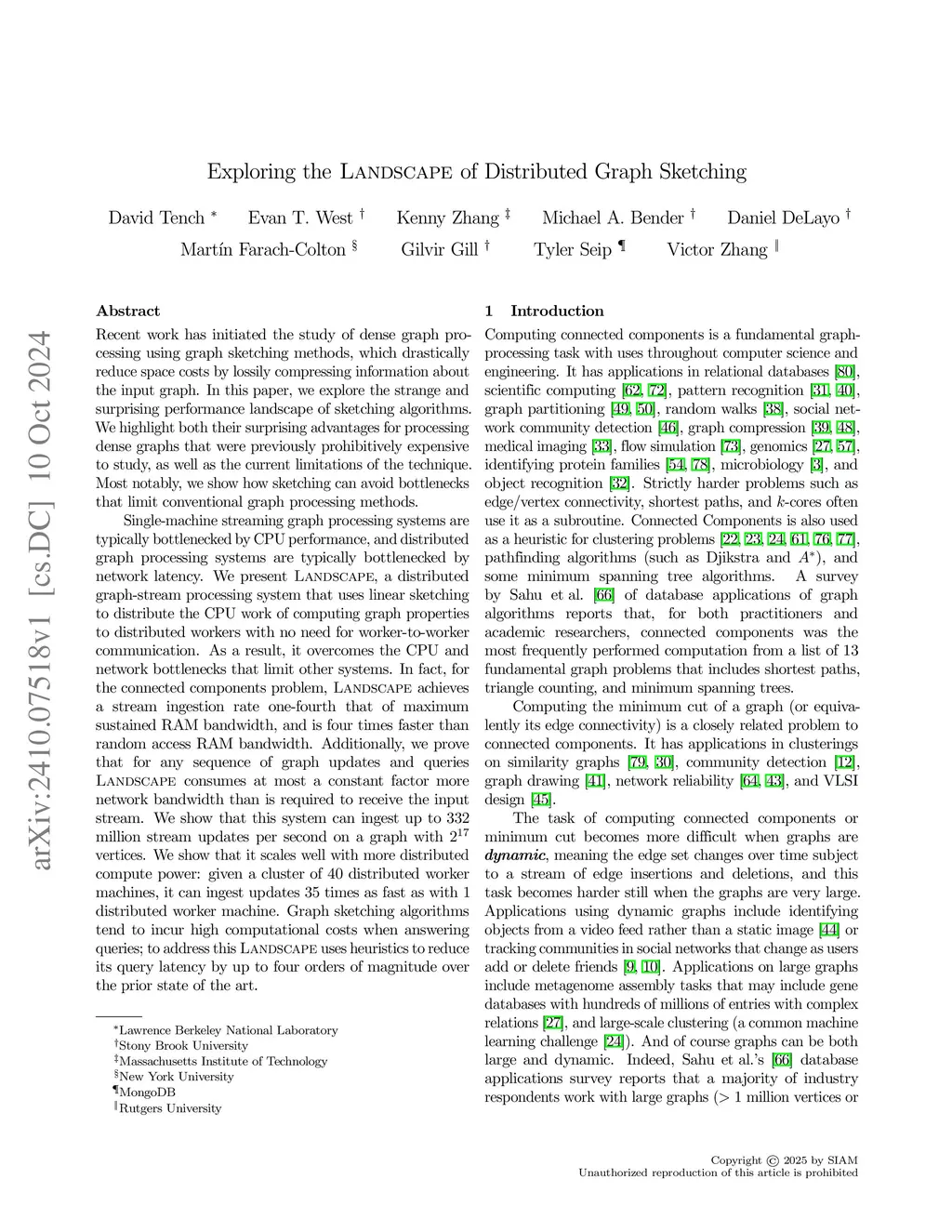 Recent work has initiated the study of dense graph processing using graph sketching methods, which drastically reduce space costs by lossily compressing information about the input graph. In this paper, we explore the strange and surprising performance landscape of sketching algorithms. We highlight both their surprising advantages for processing dense graphs that were previously prohibitively expensive to study, as well as the current limitations of the technique. Most notably, we show how sketching can avoid bottlenecks that limit conventional graph processing methods. Single-machine streaming graph processing systems are typically bottlenecked by CPU performance, and distributed graph processing systems are typically bottlenecked by network latency. We present Landscape, a distributed graph-stream processing system that uses linear sketching to distribute the CPU work of computing graph properties to distributed workers with no need for worker-to-worker communication. As a result, it overcomes the CPU and network bottlenecks that limit other systems. In fact, for the connected components problem, Landscape achieves a stream ingestion rate one-fourth that of maximum sustained RAM bandwidth, and is four times faster than random access RAM bandwidth. Additionally, we prove that for any sequence of graph updates and queries Landscape consumes at most a constant factor more network bandwidth than is required to receive the input stream. We show that this system can ingest up to 332 million stream updates per second on a graph with vertices. We show that it scales well with more distributed compute power: given a cluster of 40 distributed worker machines, it can ingest updates 35 times as fast as with 1 distributed worker machine. Landscape uses heuristics to reduce its query latency by up to four orders of magnitude over the prior state of the art.