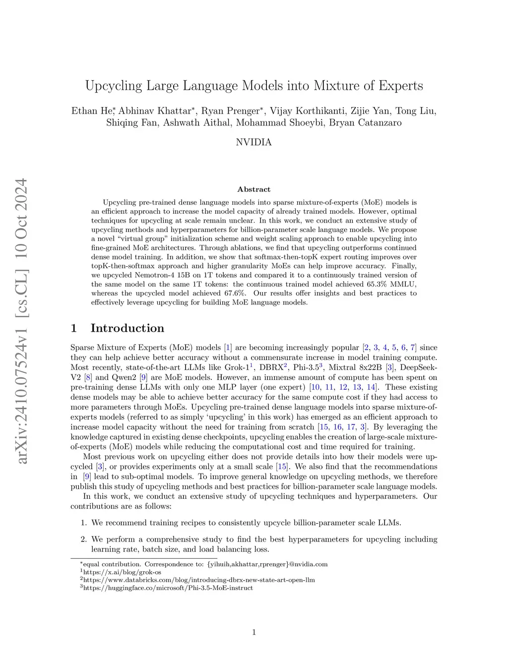 Upcycling pre-trained dense language models into sparse mixture-of-experts (MoE) models is an efficient approach to increase the model capacity of already trained models. However, optimal techniques for upcycling at scale remain unclear. In this work, we conduct an extensive study of upcycling methods and hyperparameters for billion-parameter scale language models. We propose a novel "virtual group" initialization scheme and weight scaling approach to enable upcycling into fine-grained MoE architectures. Through ablations, we find that upcycling outperforms continued dense model training. In addition, we show that softmax-then-topK expert routing improves over topK-then-softmax approach and higher granularity MoEs can help improve accuracy. Finally, we upcycled Nemotron-4 15B on 1T tokens and compared it to a continuously trained version of the same model on the same 1T tokens: the continuous trained model achieved 65.3% MMLU, whereas the upcycled model achieved 67.6%. Our results offer insights and best practices to effectively leverage upcycling for building MoE language models. Code is available.