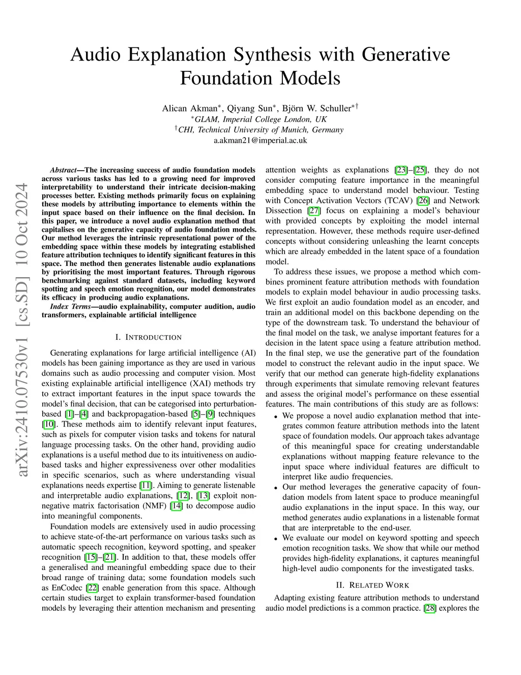 The increasing success of audio foundation models across various tasks has led to a growing need for improved interpretability to understand their intricate decision-making processes better. Existing methods primarily focus on explaining these models by attributing importance to elements within the input space based on their influence on the final decision. In this paper, we introduce a novel audio explanation method that capitalises on the generative capacity of audio foundation models. Our method leverages the intrinsic representational power of the embedding space within these models by integrating established feature attribution techniques to identify significant features in this space. The method then generates listenable audio explanations by prioritising the most important features. Through rigorous benchmarking against standard datasets, including keyword spotting and speech emotion recognition, our model demonstrates its efficacy in producing audio explanations.