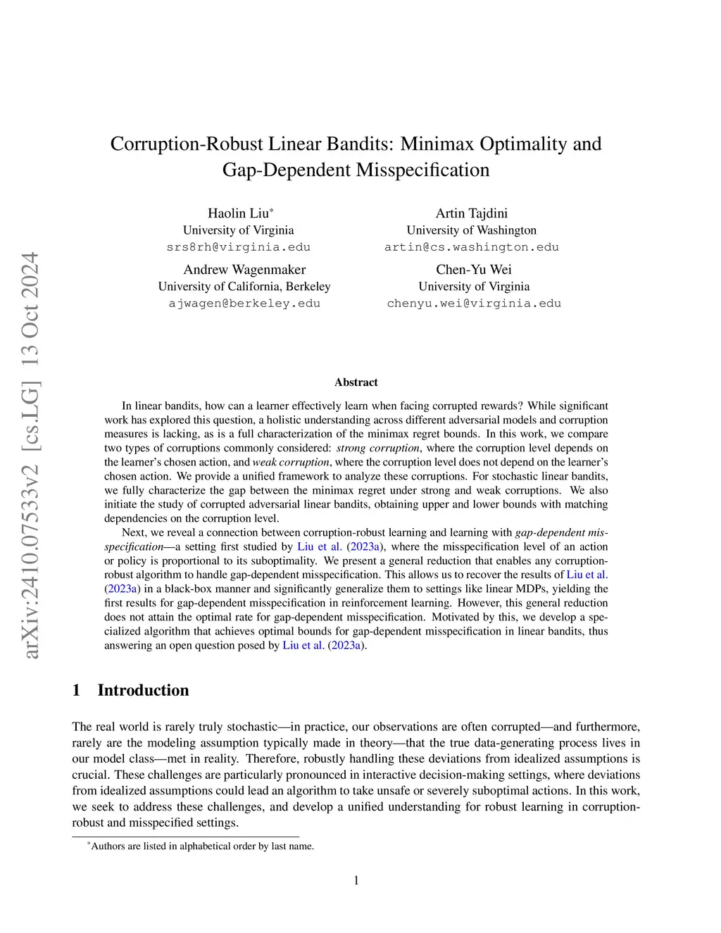 In linear bandits, how can a learner effectively learn when facing corrupted rewards? While significant work has explored this question, a holistic understanding across different adversarial models and corruption measures is lacking, as is a full characterization of the minimax regret bounds. In this work, we compare two types of corruptions commonly considered: strong corruption, where the corruption level depends on the action chosen by the learner, and weak corruption, where the corruption level does not depend on the action chosen by the learner. We provide a unified framework to analyze these corruptions. For stochastic linear bandits, we fully characterize the gap between the minimax regret under strong and weak corruptions. We also initiate the study of corrupted adversarial linear bandits, obtaining upper and lower bounds with matching dependencies on the corruption level. Next, we reveal a connection between corruption-robust learning and learning with gap-dependent mis-specification, a setting first studied by Liu et al. (2023a), where the misspecification level of an action or policy is proportional to its suboptimality. We present a general reduction that enables any corruption-robust algorithm to handle gap-dependent misspecification. This allows us to recover the results of Liu et al. (2023a) in a black-box manner and significantly generalize them to settings like linear MDPs, yielding the first results for gap-dependent misspecification in reinforcement learning. However, this general reduction does not attain the optimal rate for gap-dependent misspecification. Motivated by this, we develop a specialized algorithm that achieves optimal bounds for gap-dependent misspecification in linear bandits, thus answering an open question posed by Liu et al. (2023a).
