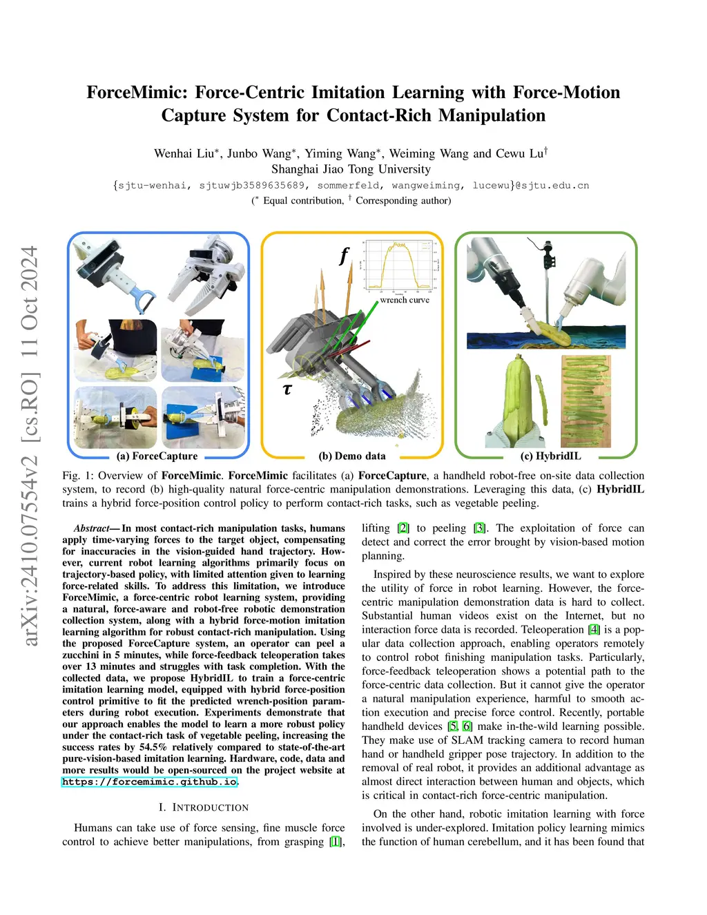 In most contact-rich manipulation tasks, humans apply time-varying forces to the target object, compensating for inaccuracies in the vision-guided hand trajectory. However, current robot learning algorithms primarily focus on trajectory-based policy, with limited attention given to learning force-related skills. To address this limitation, we introduce ForceMimic, a force-centric robot learning system, providing a natural, force-aware and robot-free robotic demonstration collection system, along with a hybrid force-motion imitation learning algorithm for robust contact-rich manipulation. Using the proposed ForceCapture system, an operator can peel a zucchini in 5 minutes, while force-feedback teleoperation takes over 13 minutes and struggles with task completion. With the collected data, we propose HybridIL to train a force-centric imitation learning model, equipped with hybrid force-position control primitive to fit the predicted wrench-position parameters during robot execution. Experiments demonstrate that our approach enables the model to learn a more robust policy under the contact-rich task of vegetable peeling, increasing the success rates by 54.5% relatively compared to state-ofthe-art pure-vision-based imitation learning. Hardware, code, data and more results can be found on the project website atthis https URL.