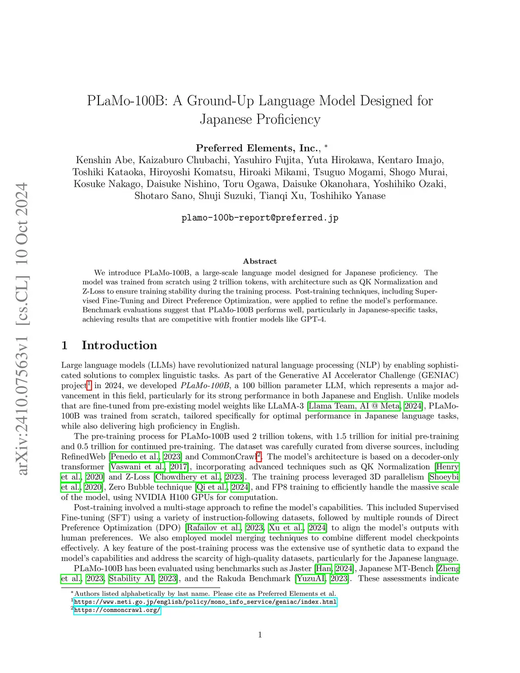 We introduce PLaMo-100B, a large-scale language model designed for Japanese proficiency. The model was trained from scratch using 2 trillion tokens, with architecture such as QK Normalization and Z-Loss to ensure training stability during the training process. Post-training techniques, including Supervised Fine-Tuning and Direct Preference Optimization, were applied to refine the model's performance. Benchmark evaluations suggest that PLaMo-100B performs well, particularly in Japanese-specific tasks, achieving results that are competitive with frontier models like GPT-4. The base model is available at https://huggingface.co/pfnet/plamo-100b.