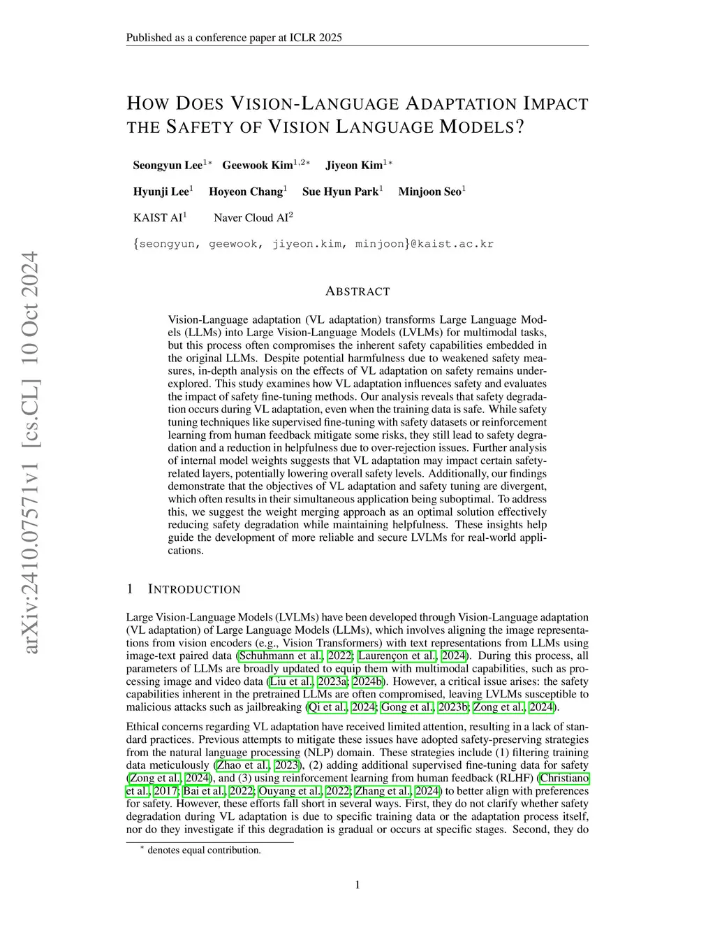 Vision-Language adaptation (VL adaptation) transforms Large Language Models (LLMs) into Large Vision-Language Models (LVLMs) for multimodal tasks, but this process often compromises the inherent safety capabilities embedded in the original LLMs. Despite potential harmfulness due to weakened safety measures, in-depth analysis on the effects of VL adaptation on safety remains under-explored. This study examines how VL adaptation influences safety and evaluates the impact of safety fine-tuning methods. Our analysis reveals that safety degradation occurs during VL adaptation, even when the training data is safe. While safety tuning techniques like supervised fine-tuning with safety datasets or reinforcement learning from human feedback mitigate some risks, they still lead to safety degradation and a reduction in helpfulness due to over-rejection issues. Further analysis of internal model weights suggests that VL adaptation may impact certain safety-related layers, potentially lowering overall safety levels. Additionally, our findings demonstrate that the objectives of VL adaptation and safety tuning are divergent, which often results in their simultaneous application being suboptimal. To address this, we suggest the weight merging approach as an optimal solution effectively reducing safety degradation while maintaining helpfulness. These insights help guide the development of more reliable and secure LVLMs for real-world applications.