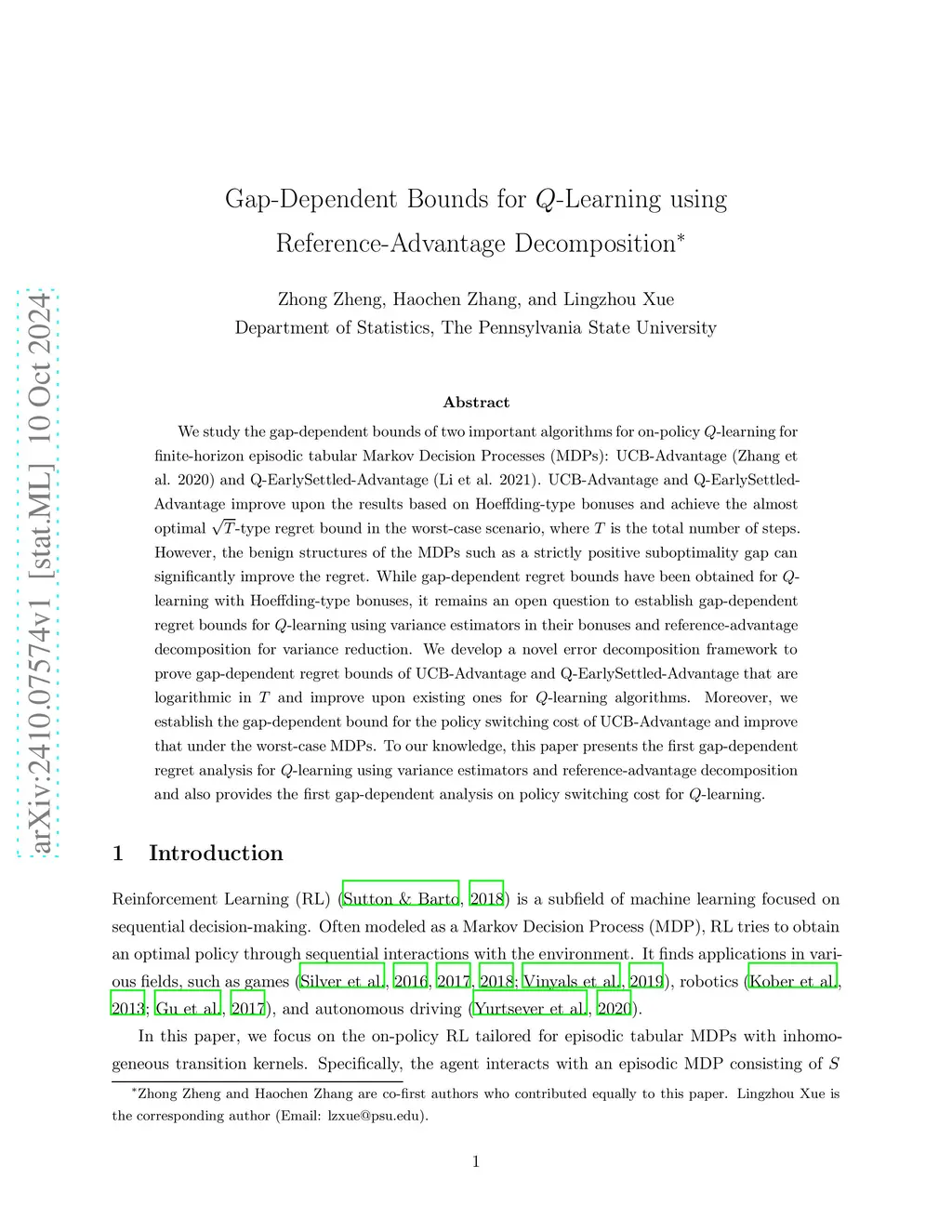 Gap-Dependent Bounds for Q-Learning using Reference-Advantage Decomposition