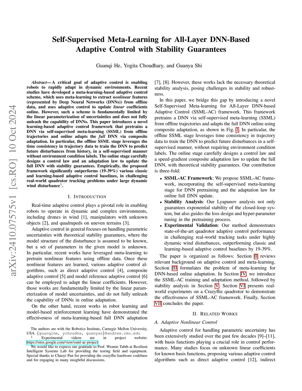 A critical goal of adaptive control is enabling robots to rapidly adapt in dynamic environments. Recent studies have developed a meta-learning-based adaptive control scheme, which uses meta-learning to extract nonlinear features (represented by Deep Neural Networks (DNNs)) from offline data, and uses adaptive control to update linear coefficients online. However, such a scheme is fundamentally limited by the linear parameterization of uncertainties and does not fully unleash the capability of DNNs. This paper introduces a novel learning-based adaptive control framework that pretrains a DNN via self-supervised meta-learning (SSML) from offline trajectories and online adapts the full DNN via composite adaptation. In particular, the offline SSML stage leverages the time consistency in trajectory data to train the DNN to predict future disturbances from history, in a self-supervised manner without environment condition labels. The online stage carefully designs a control law and an adaptation law to update the full DNN with stability guarantees. Empirically, the proposed framework significantly outperforms (19-39%) various classic and learning-based adaptive control baselines, in challenging real-world quadrotor tracking problems under large dynamic wind disturbance.