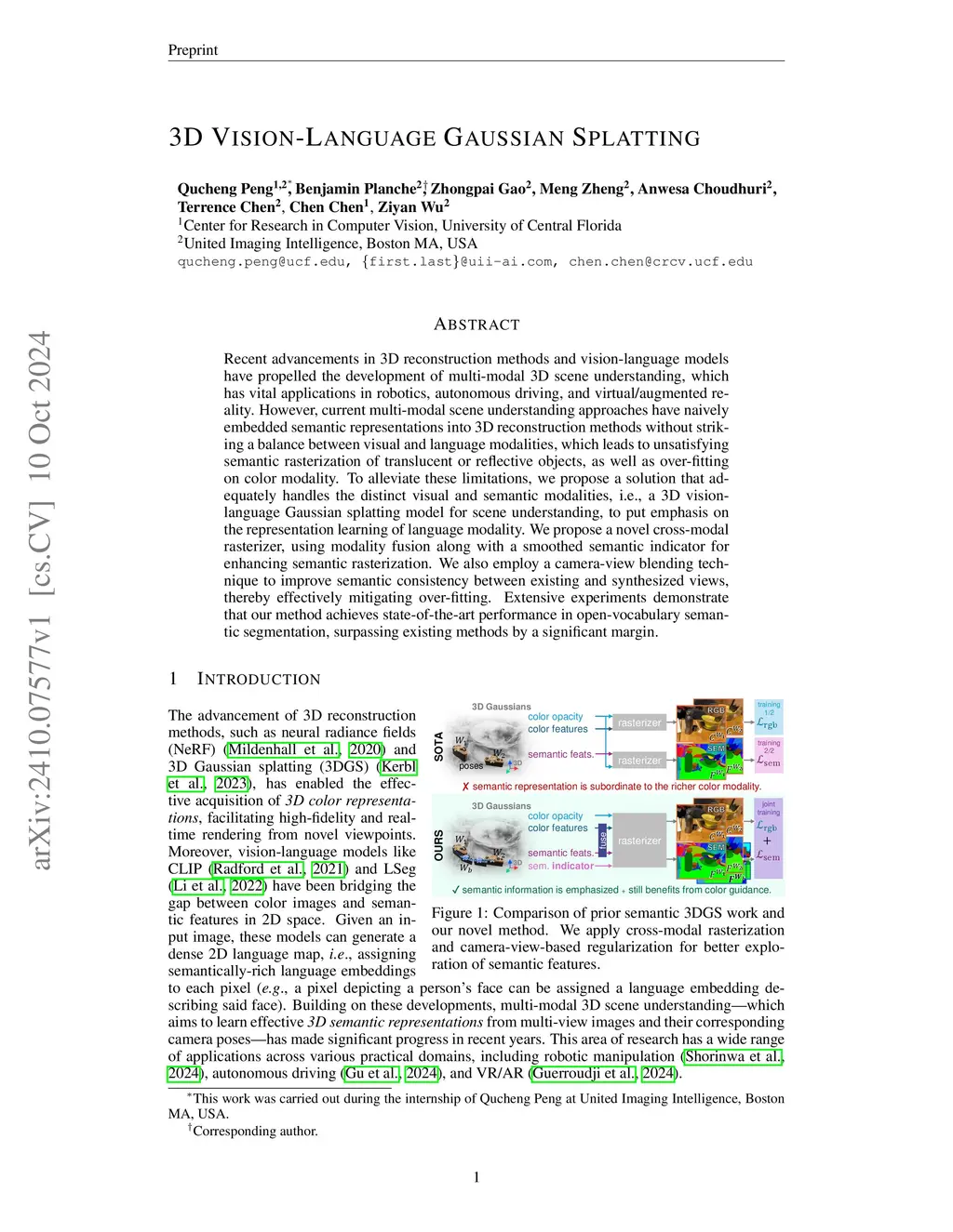 Recent advancements in 3D reconstruction methods and vision-language models have propelled the development of multi-modal 3D scene understanding, which has vital applications in robotics, autonomous driving, and virtual/augmented reality. However, current multi-modal scene understanding approaches have naively embedded semantic representations into 3D reconstruction methods without striking a balance between visual and language modalities, which leads to unsatisfying semantic rasterization of translucent or reflective objects, as well as over-fitting on color modality. To alleviate these limitations, we propose a solution that adequately handles the distinct visual and semantic modalities, i.e., a 3D vision-language Gaussian splatting model for scene understanding, to put emphasis on the representation learning of language modality. We propose a novel cross-modal rasterizer, using modality fusion along with a smoothed semantic indicator for enhancing semantic rasterization. We also employ a camera-view blending technique to improve semantic consistency between existing and synthesized views, thereby effectively mitigating over-fitting. Extensive experiments demonstrate that our method achieves state-of-the-art performance in open-vocabulary semantic segmentation, surpassing existing methods by a significant margin.