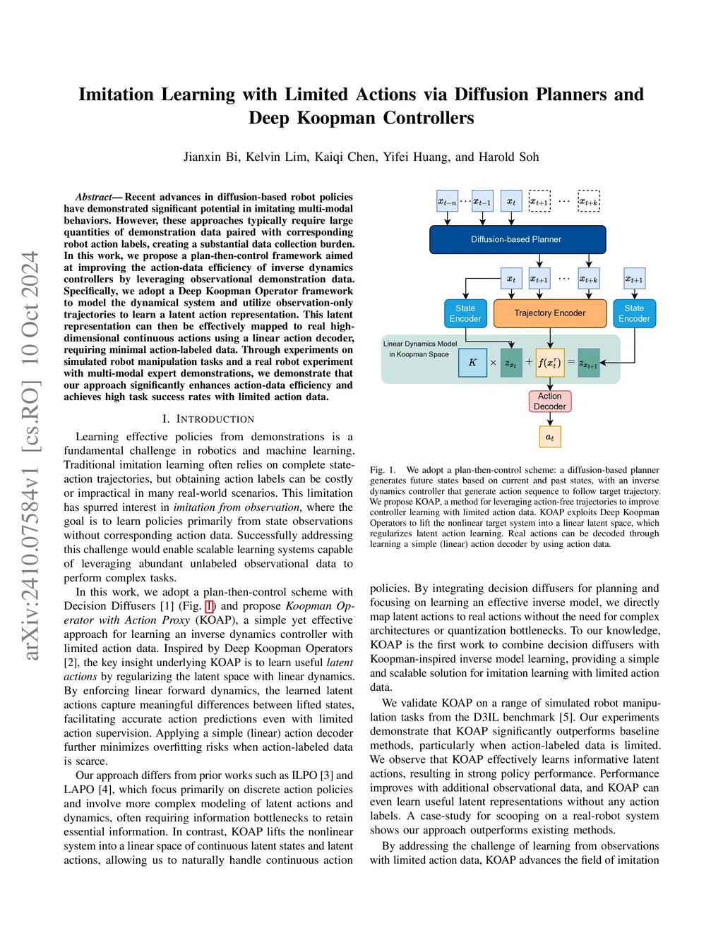 Imitation Learning with Limited Actions via Diffusion Planners and Deep Koopman Controllers