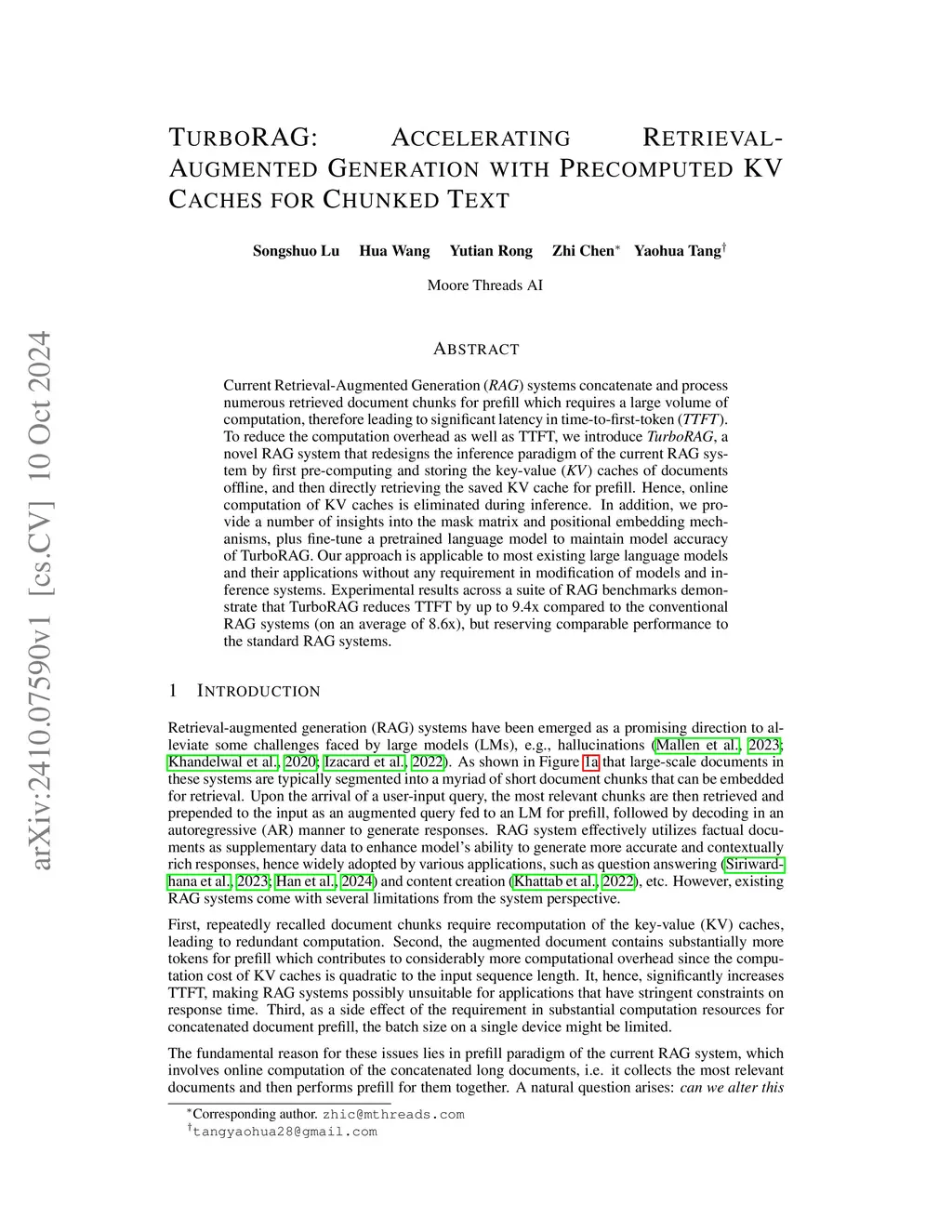 TurboRAG: Accelerating Retrieval-Augmented Generation with Precomputed
