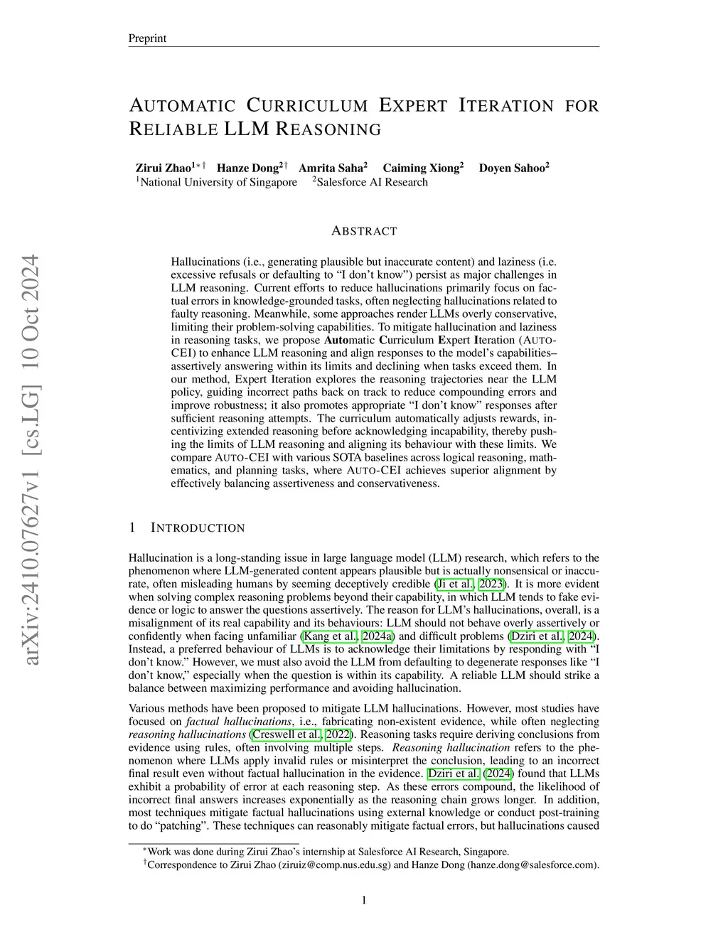 Hallucinations (i.e., generating plausible but inaccurate content) and laziness (i.e. excessive refusals or defaulting to "I don't know") persist as major challenges in LLM reasoning. Current efforts to reduce hallucinations primarily focus on factual errors in knowledge-grounded tasks, often neglecting hallucinations related to faulty reasoning. Meanwhile, some approaches render LLMs overly conservative, limiting their problem-solving capabilities. To mitigate hallucination and laziness in reasoning tasks, we propose Automatic Curriculum Expert Iteration (Auto-CEI) to enhance LLM reasoning and align responses to the model's capabilities--assertively answering within its limits and declining when tasks exceed them. In our method, Expert Iteration explores the reasoning trajectories near the LLM policy, guiding incorrect paths back on track to reduce compounding errors and improve robustness; it also promotes appropriate "I don't know" responses after sufficient reasoning attempts. The curriculum automatically adjusts rewards, incentivizing extended reasoning before acknowledging incapability, thereby pushing the limits of LLM reasoning and aligning its behaviour with these limits. We compare Auto-CEI with various SOTA baselines across logical reasoning, mathematics, and planning tasks, where Auto-CEI achieves superior alignment by effectively balancing assertiveness and conservativeness. The code is available atthis https URL.